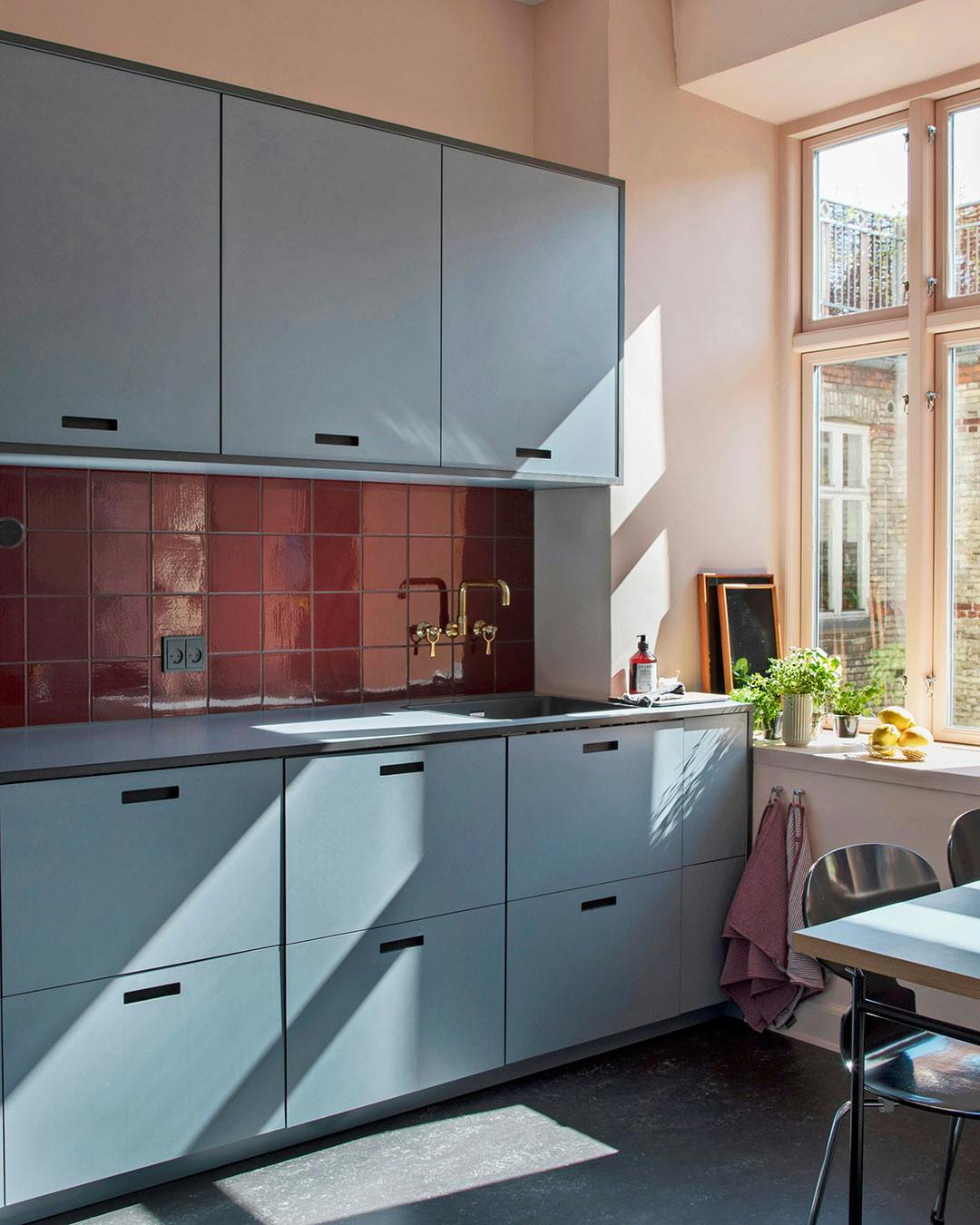 Hvis dit køkken er gammelt og egentlig bare trænger til at blive skiftet ud, kan du forlænge levetiden en smule med en klat maling. Vil du skabe en vild effekt, kan du male bagvæggen mellem fronter og overskabe i samme farve. Skift også gerne grebene for lidt ekstra fornyelse – og vupti, så har du et ”nyt” køkken. Køkkenet her er oprindeligt fra Ikea.
