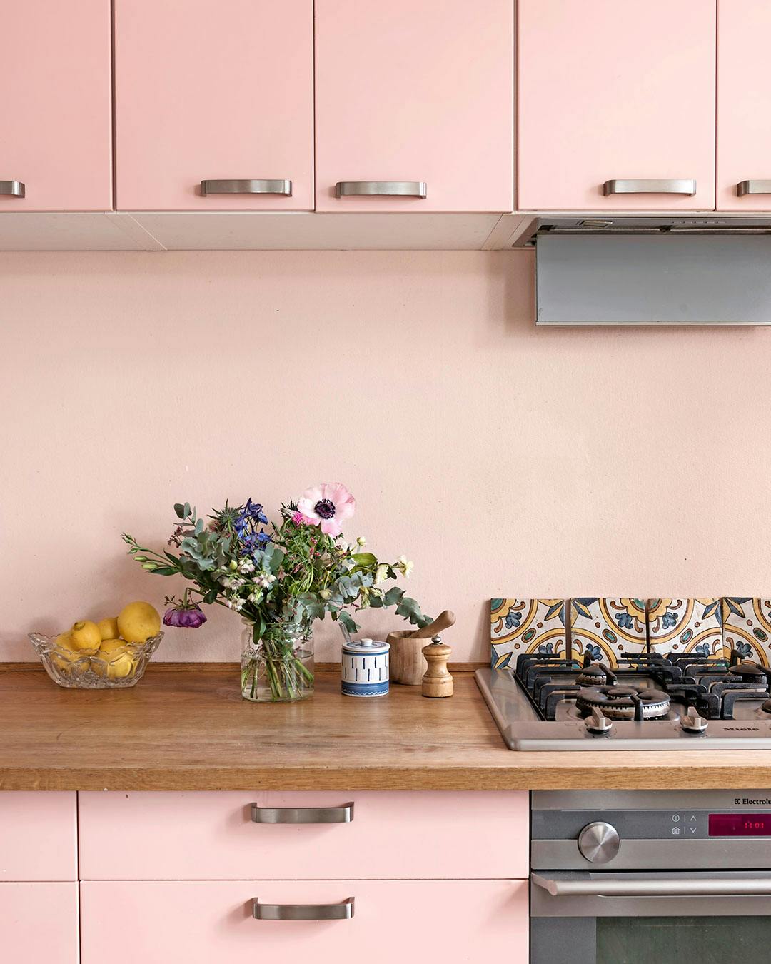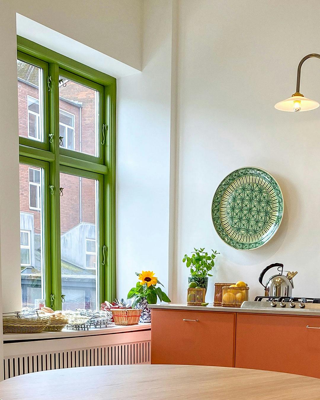 Måske har du lagt mærke til, at der de senere år har sneget farver ind på både karme, døre og lister? Hvis du vil give dit køkken et personligt udtryk, kan du driste dig til at male vindueskarmene i en frisk farve. Lad eventuelt farven gå igen på enkelte elementer som f.eks. en vase på bordet eller nogle kopper på en åben hylde. Det skaber sammenhæng i rummet. Her er karmene malet i farven Sweet peas fra File Under Pop.