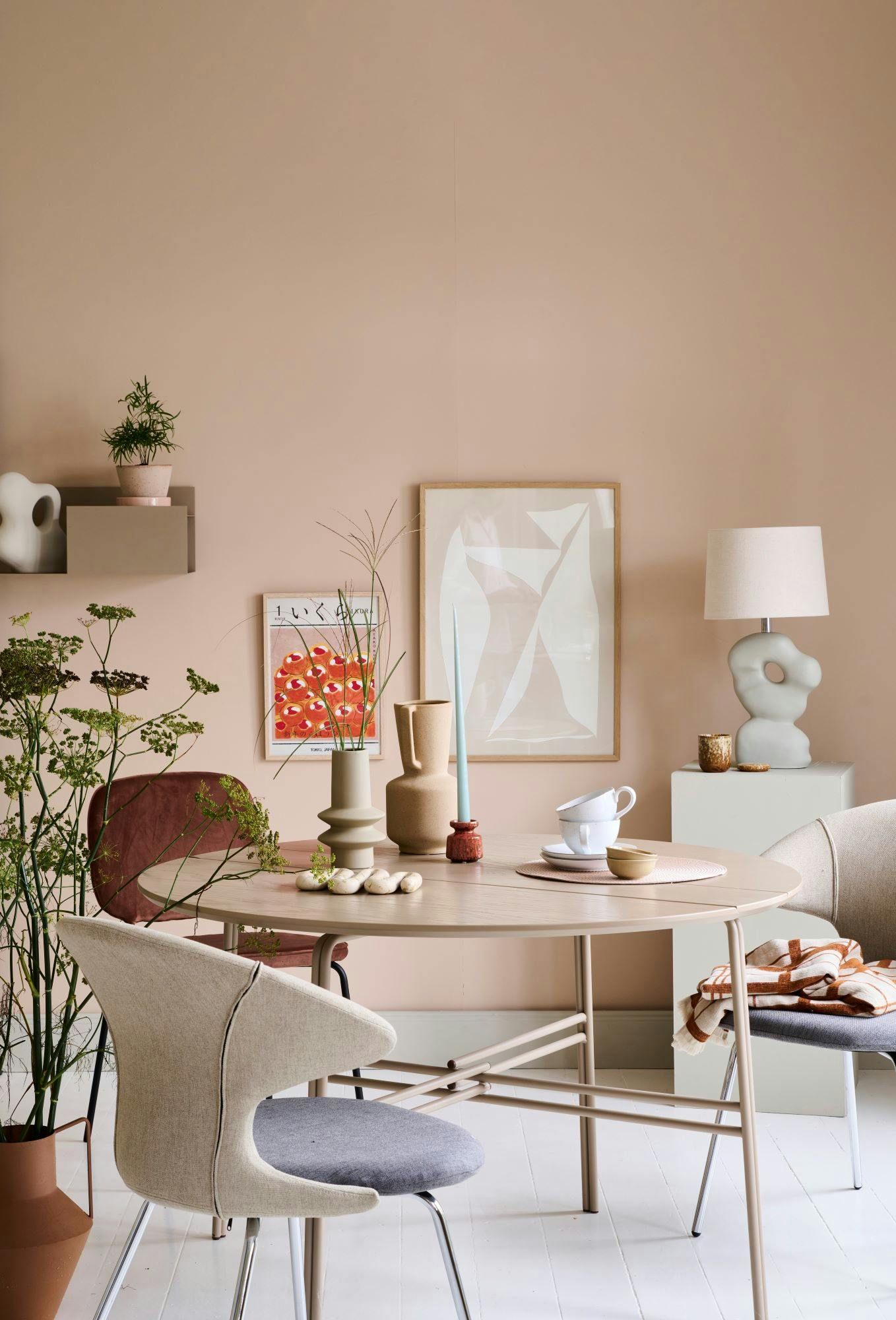 Brug brændte toner til at give kant til lyse og lette farver. Bland stole, og vælg brugsting, der samtidig er skulpturelle. Så får du en stemning af et hjem i konstant bevægelse.
