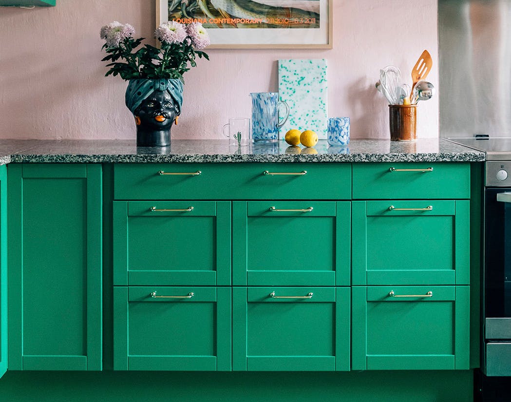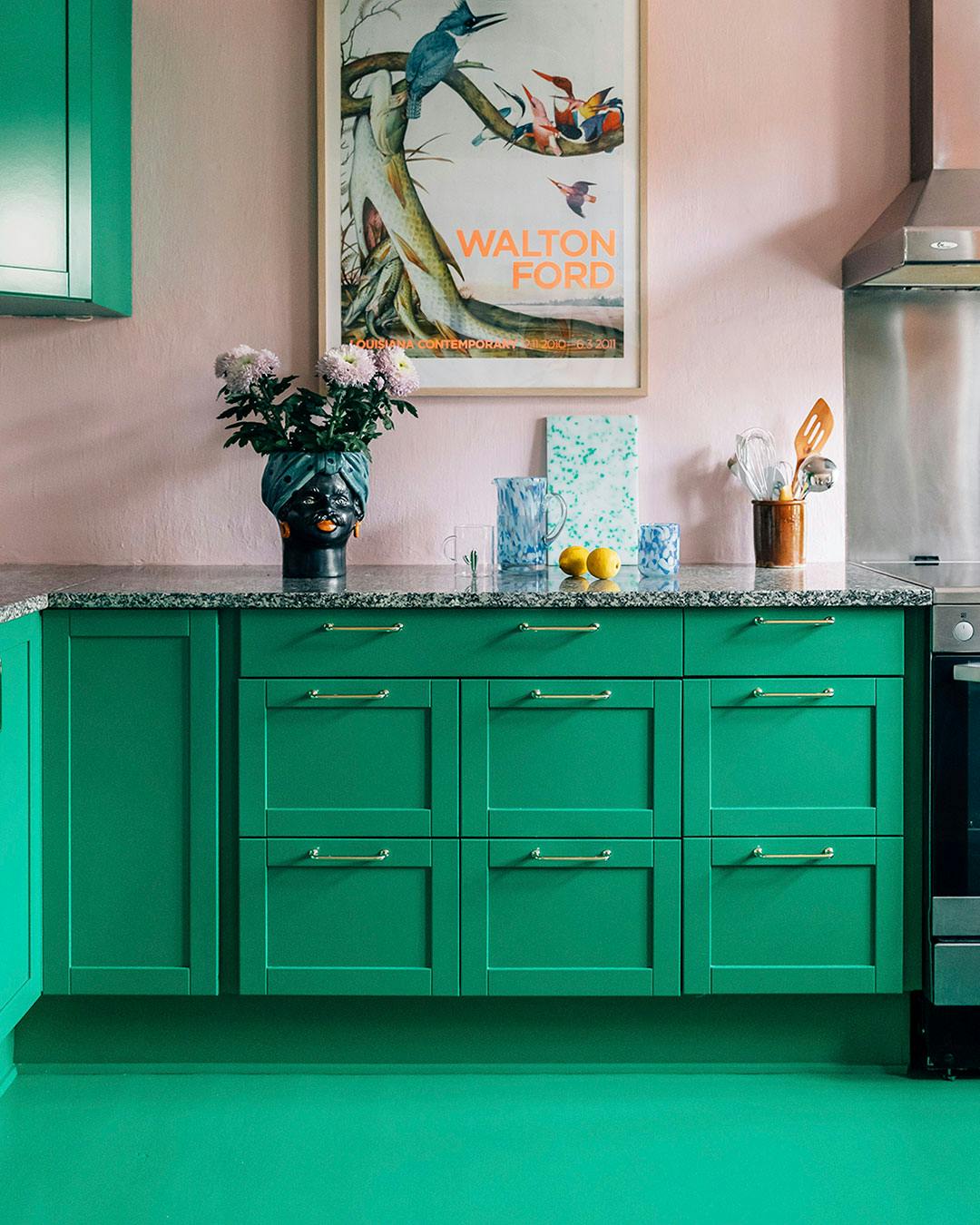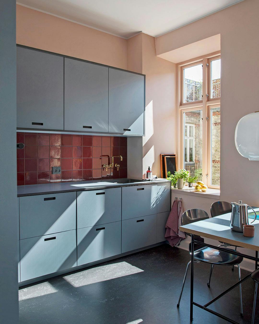 Gå efter komplementærfarver eller farver, der står i kontrast til hinanden. Her fremhæver de de lyserøde vægge og de vinrøde klinker de blå køkkenskabe. Køkkenmodulerne er fra Ikea med nye fronter fra &SHUFL.