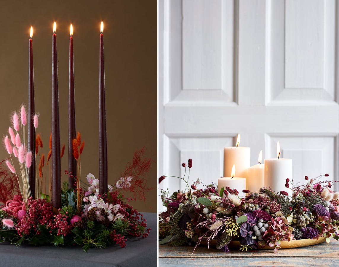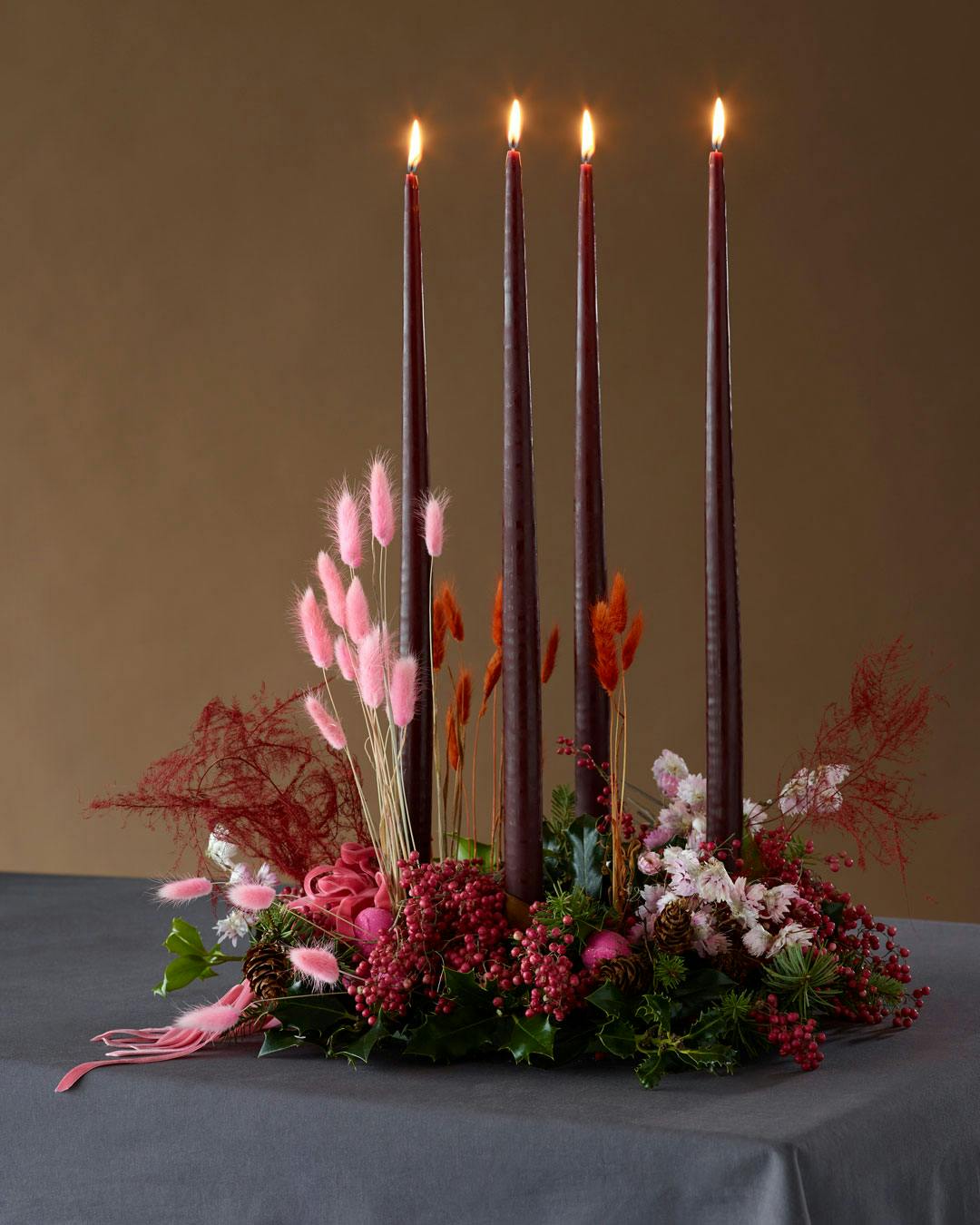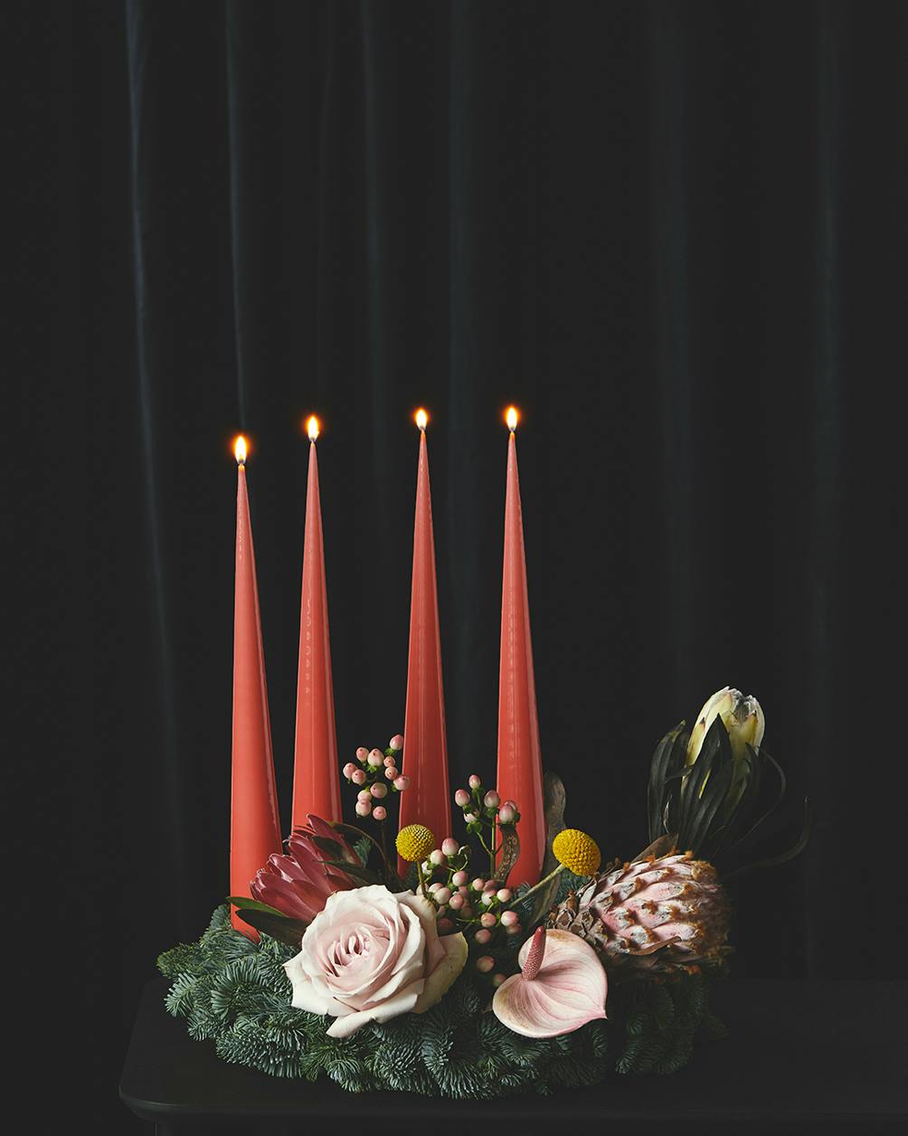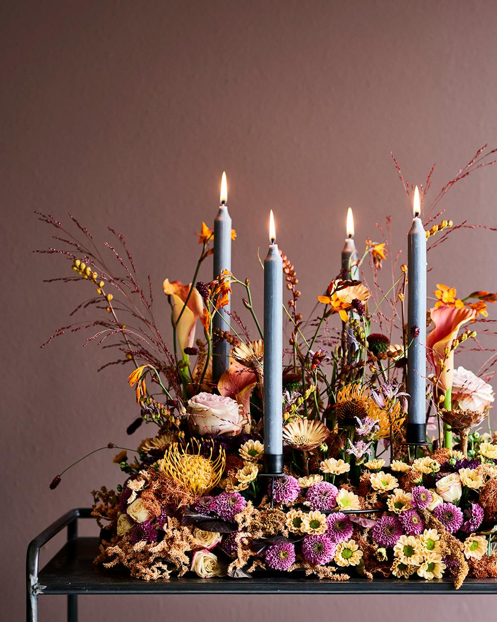 Sæt lysene på en række i den ene side af kransen for et asymmetrisk look. Placér blomsterne i grupper, og variér længden af blomsternes stilke – det giver et mere tilfældigt og moderne udtryk. Vælg blomster og lys, der harmonerer, men ikke er ens. Laklysene er fra Ester & Erik.