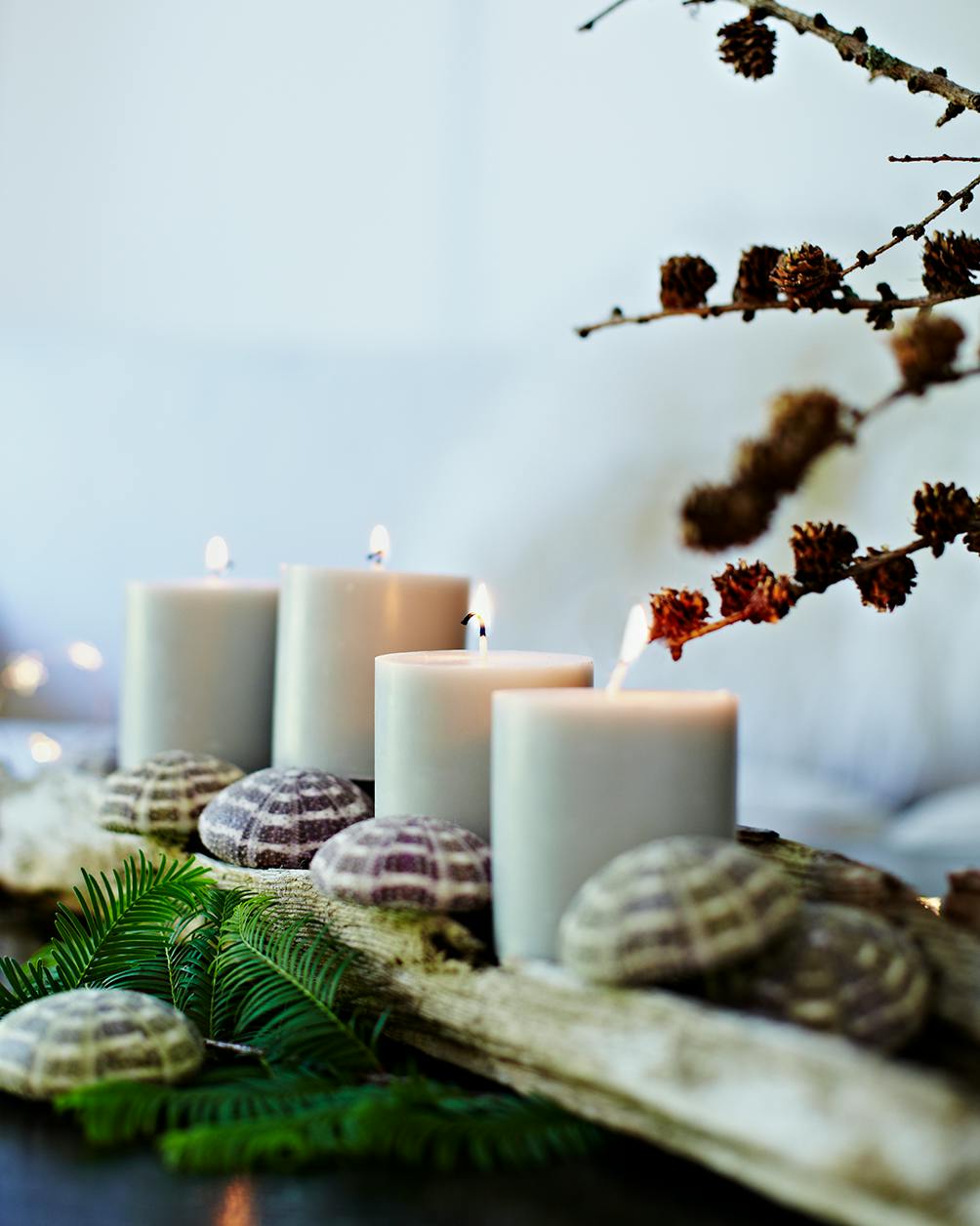 Giv hvert af de fire lys en lille klat ler i bunden, og tryk bunden mod drivtømmeret, så lyset sidder godt fast. Lysene må gerne være lidt forskudte i forhold til hinanden. Arranger søpindsvin eller sten omkring lysene, og afslut med en grangren. Husk at holde øje med lysene, når de er tændt.