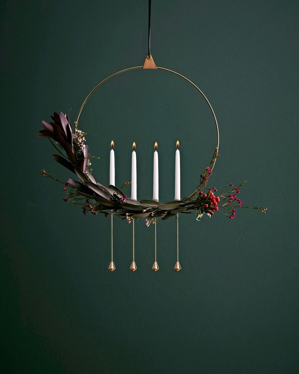 En messingring med grene og blomster skaber en enkel adventsdekoration, hvis du hænger fire lyseholdere på. Du kan selv vælge mellem grene og blomster, så den passer ind til din personlige stil.