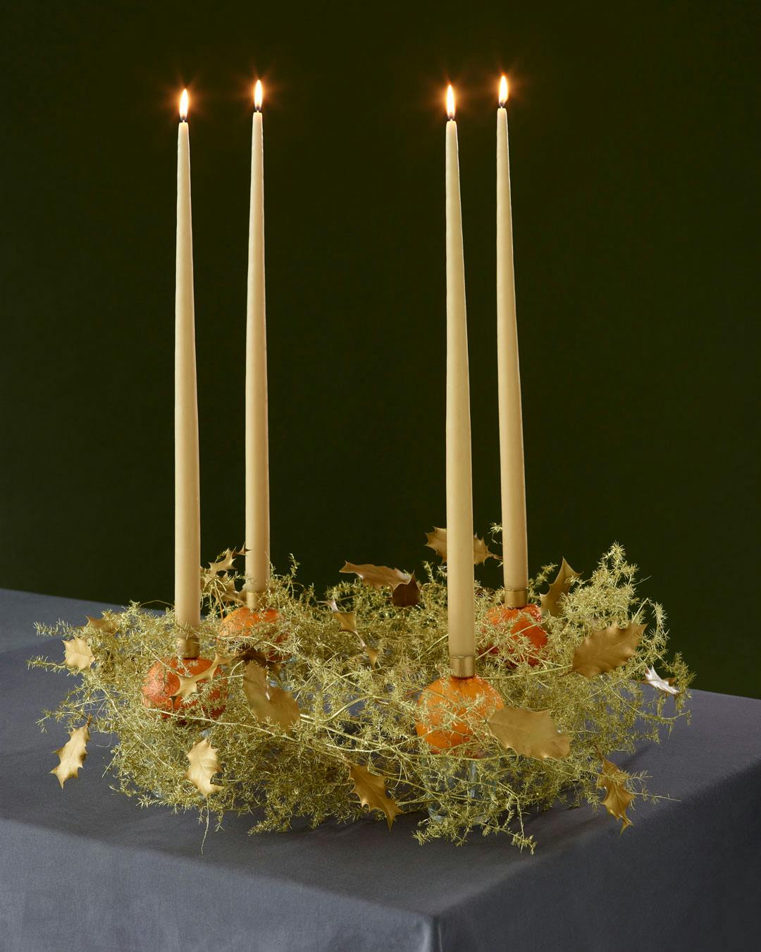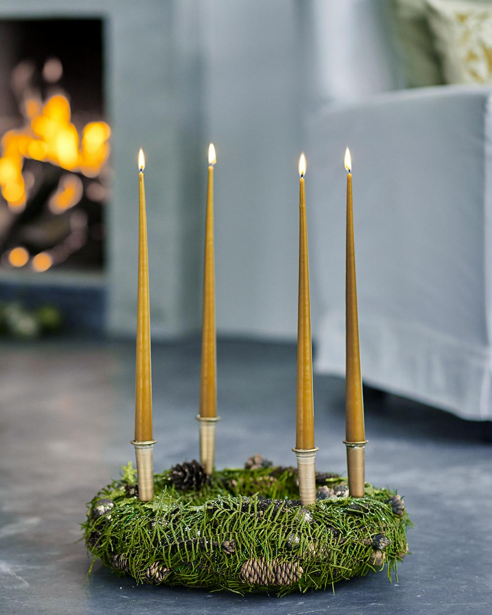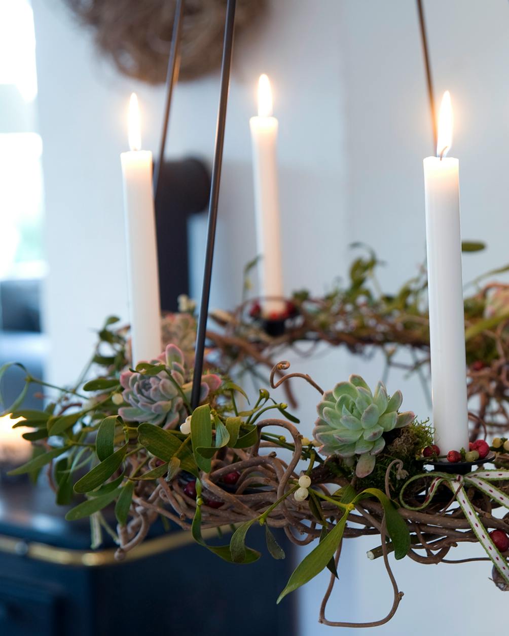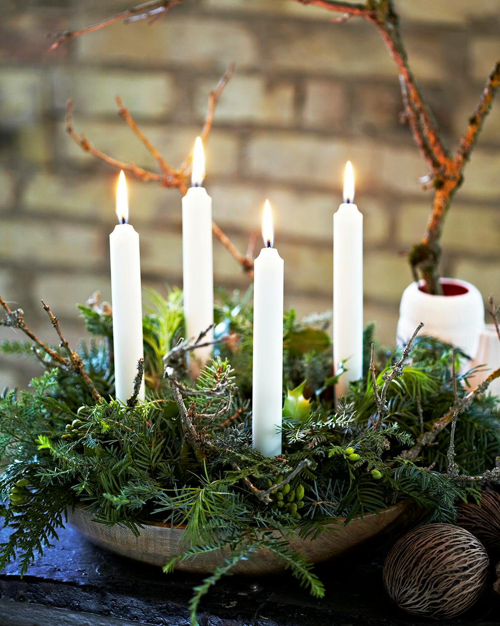 Få evt. din blomsterhandler til at binde en krans af nøgne grene til dig, så du bare skal vikle bærgrene omkring den. Sæt fire lyseholdere i, bind fire bånd omkring, og kransen er klar til at oplyse stuen.