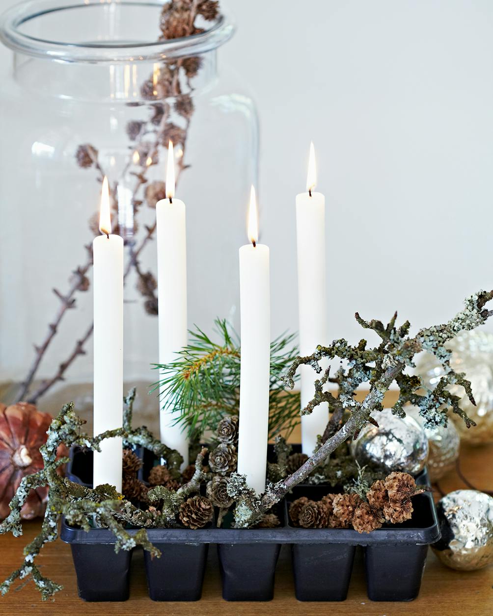 Rengør og tør emballagen. Klip stykker af oasis, som passer i størrelsen til emballagens huller, og pres oasis ned i. Stil lysene i fire af hullerne, og arranger grenene i de andre huller - de må gerne "stritte lidt op" for en skulpturel virkning. Dæk oasis med små lærkekogler. Lav evt. et lille stilleben med små sølvkugler og en stor pinjekogle som kontrast.