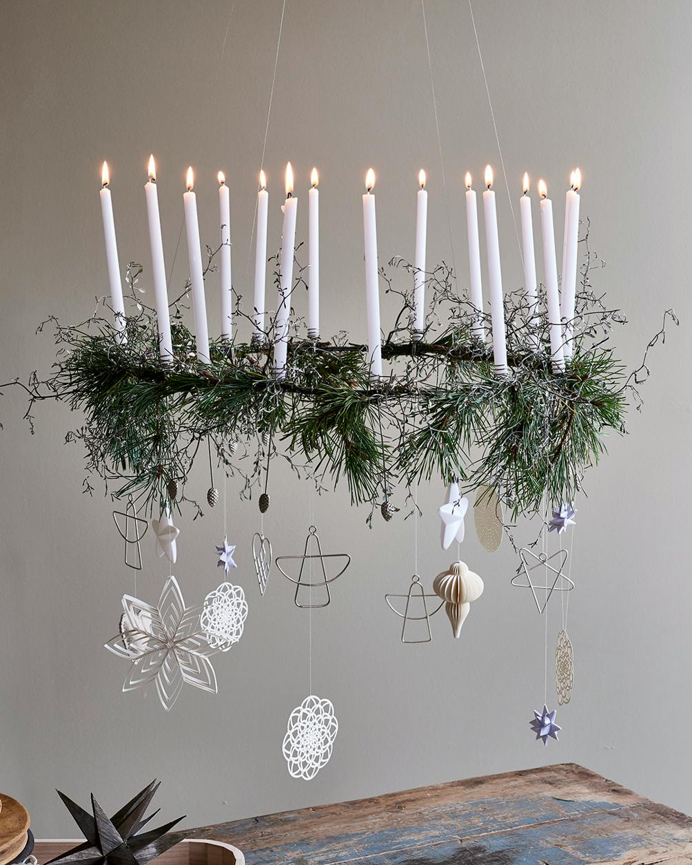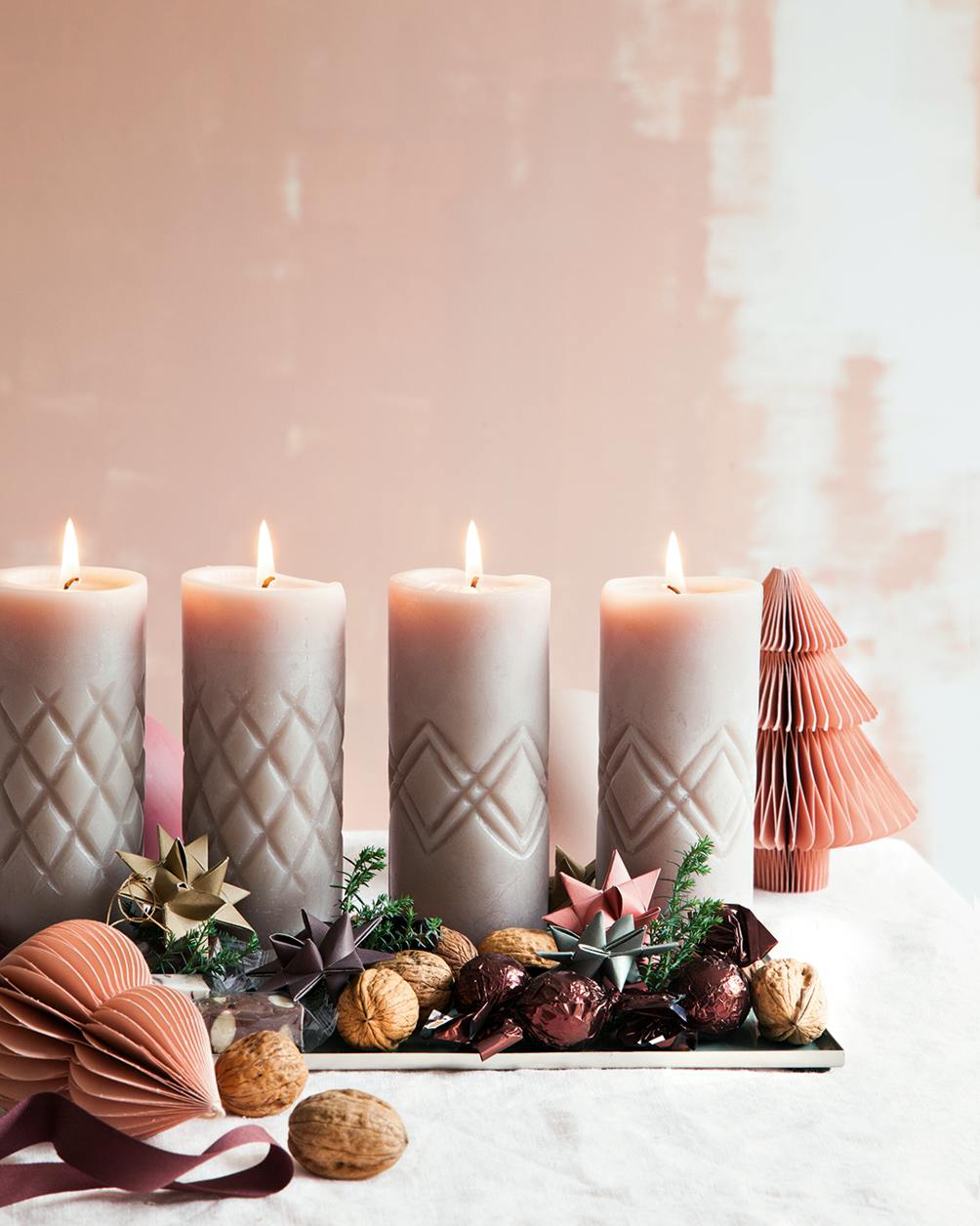 Lys med præget mønster, flettede stjerner og papirfoldepynt (Broste Copenhagen), karameller og chokolader (Notre Dame).