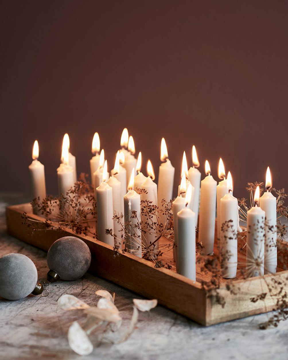 Lav en simpel bakke med 24 lys, og lad de mange tændte lys sprede den varmeste julestemning. Tænd seks lys i en klynge ved søndag i advent, eller tæl ned til juleaften, og tænd et nyt lys hver dag. En simpel dekoration til dig, der ikke har grønne fingre.