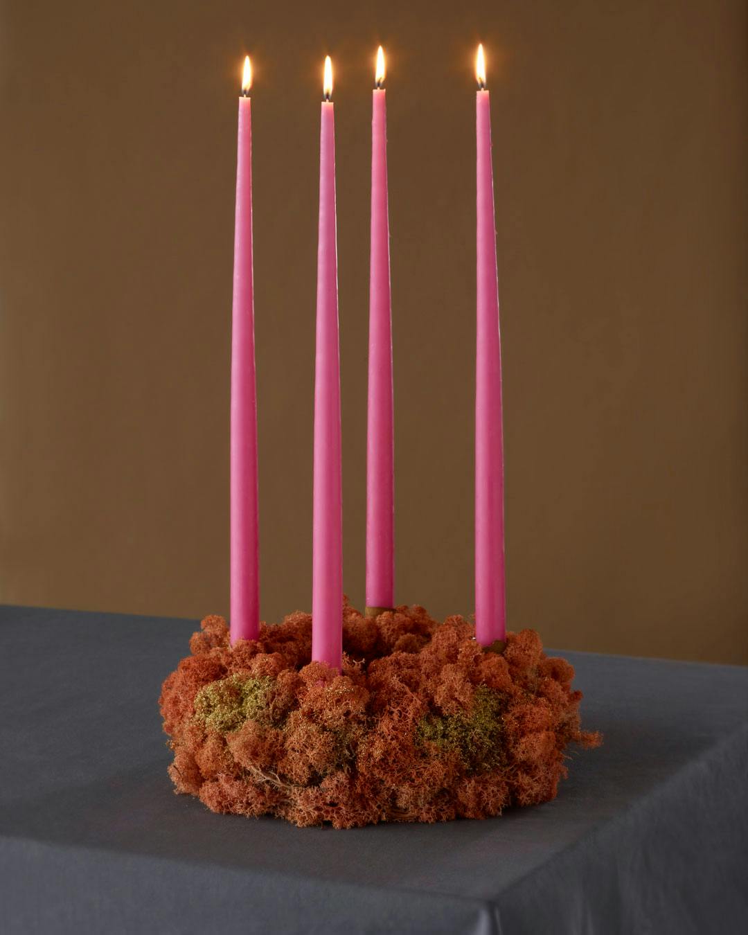 Bind den indfarvede mos omkring en halmkrans i ønsket størrelse, og fastgør mosset med vindseltråd. Sæt derefter de fire lys i lyseholdere, og placér dem over for hinanden i kransen. Slut af med at sprøjte lidt lak, så mosset holder sin form, og drys til sidst med guldstøv, så kransen skinner diskret.