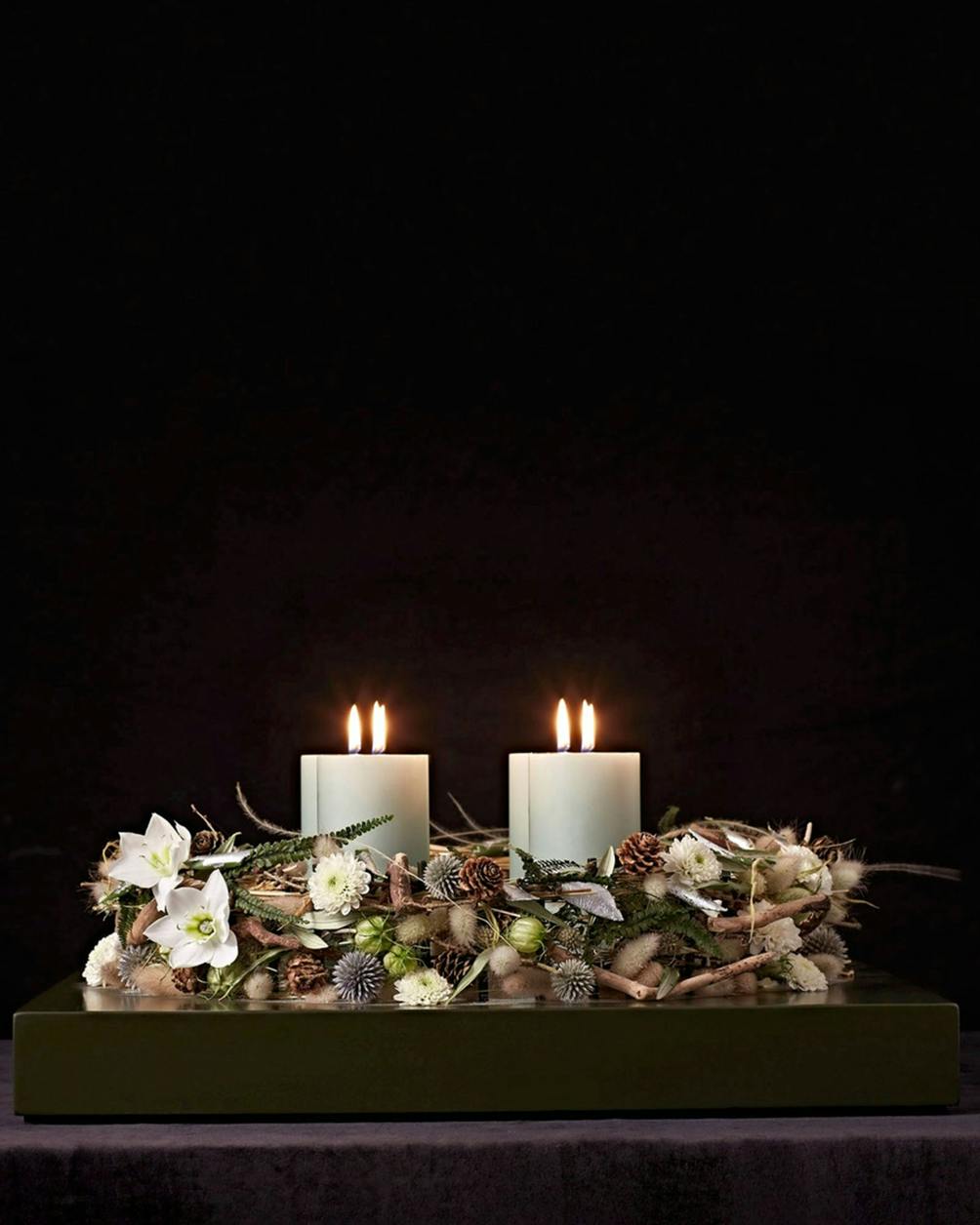 TIP! For at lave adventsdekorationerne her, kommer du langt med følgende materialer: Ståltråd til at vikle materialer omkring kranse og grene, en saks, mos, grene med bær, grene med blade, kogler, blomster – både tørrede og friske – lys, lyseholdere og anden diskret pynt.