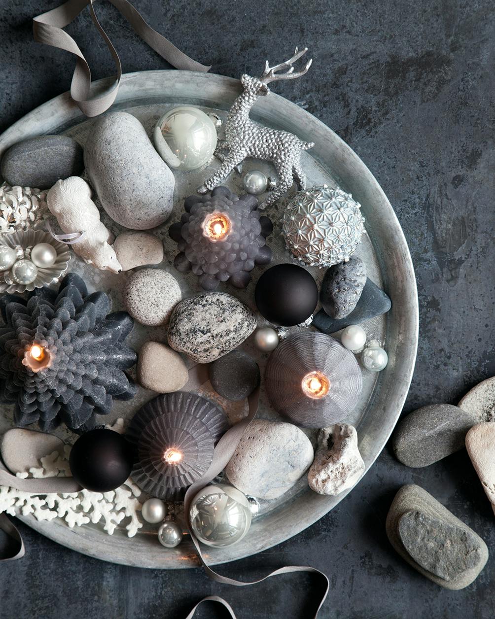 Placér de 4 lys på metalfadet, evt. med vokspuder, så de står ordentligt fast. Læg sten og julepynt i hvidt, sølv og evt. et par sorte ting på fadet, så det bliver fyldt ud.