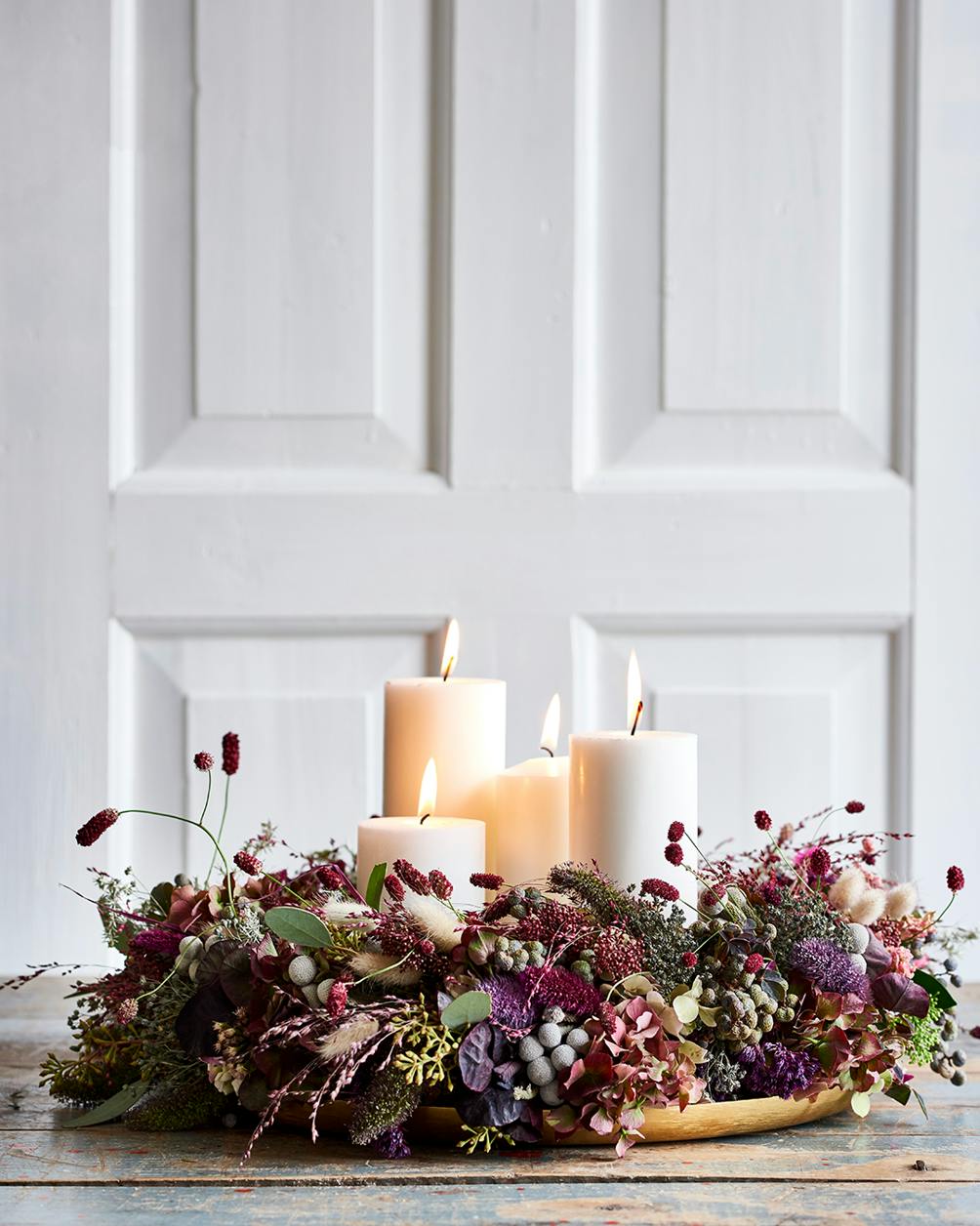 Gør oasiskransen våd, og sæt de lange stearinlys fast i kransen med lige afstand. Dæk kanten med små granspidser og kvisttorn, og placér musehaler, kornblomster, rosenpeber, papirknopper og grankogler i små grupper, indtil oasiskransen er helt dækket. Lad gerne enkelte blomster flyde med det grønne ud over bordkanten for et mere skødesløst udtryk. Slut af med at tilføje en stor sløjfe i velourbånd. Alternativt kan du binde fire mindre sløjfer og placere dem rundt om hvert enkelt lys.