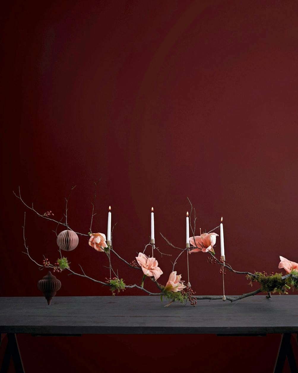 En adventskrans kan sagtens være spinkel og elegant. Tag en nedfalden gren med hjem fra skoven – eller blomsterhandleren – og pynt den med mos, amaryllis og grene med bær. Julekugler og lyseholdere fuldender dekorationen, der løfter julestemningen på spisebordet. Karen Blixen, forgyldt lyseholder. H 17 cm, 129,95 kr. (Rosendahl). Paper Jewel og Paper Scoop, julekugler i papir med lædersnor. Ø 7,5-10 cm, 49 kr. pr. stk. (Nordstjerne).