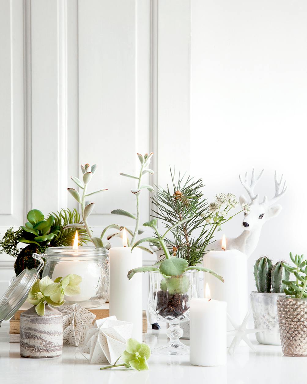 Sæt et enkelt lys i et syltetøjsglas og resten på en bakke, direkte på bordet eller i vindueskarmen. Sæt de små kaktusser og sukkulenter i forskellige glas, og placér dem imellem lysene. Suppler med en enkelt grankvist i en vase og et par juleroser. Dekorér med julepynt og en hvid hjort.