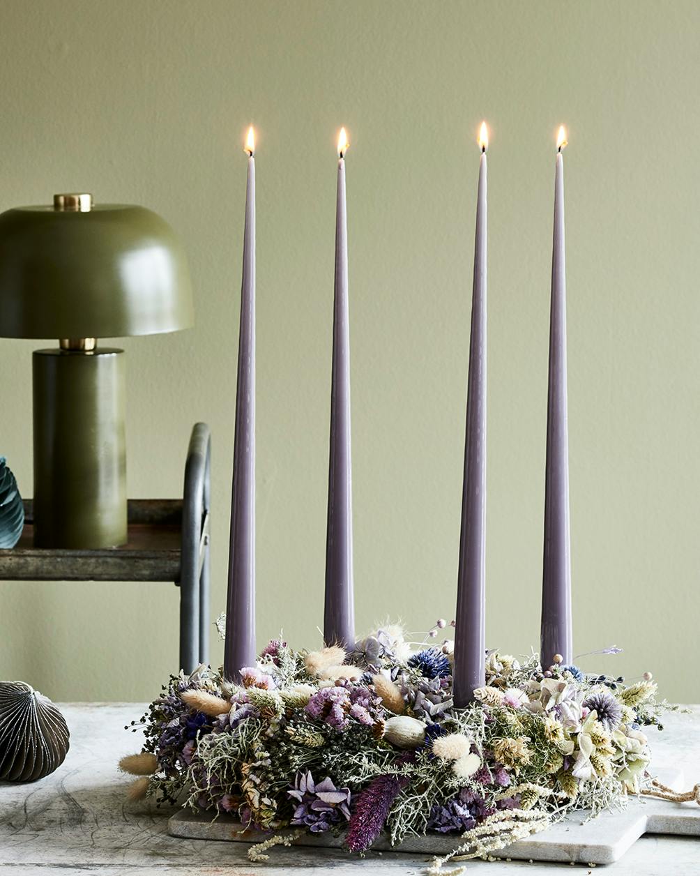 Tørrede blomster er tilbage i indretningen, hvorfor de selvfølgelig også kan bruges til jul. Lav en enkel, men effektfuld adventskrans ved at fæstne forskellige tørrede blomster på en bladkrans og placere fire lys i kransens midte. Brug dine farvorit blomster, så den passer til din personlige stil.