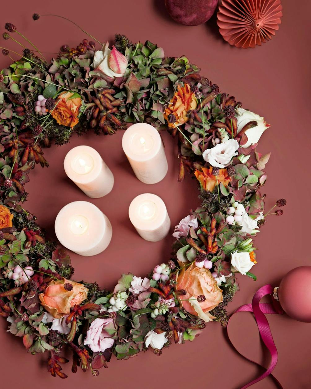 Skab en farvestrålende og overdådig adventskrans med blomster og kulørte lys. Kombinér gerne store og små blomsterhoveder, og tilføj enkelte grene med bær.