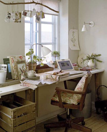 På midten af hendes skrivebord har Louise placeret en slidt træbakke til de mest nødvendige mapper og kontorartikler, der er rare at have inden for rækkevidde. Det lyse, let transparente, rullegardin, der er købt billigt, lader dagslyset slippe ind, samtidig med at det skærmer for solen.
