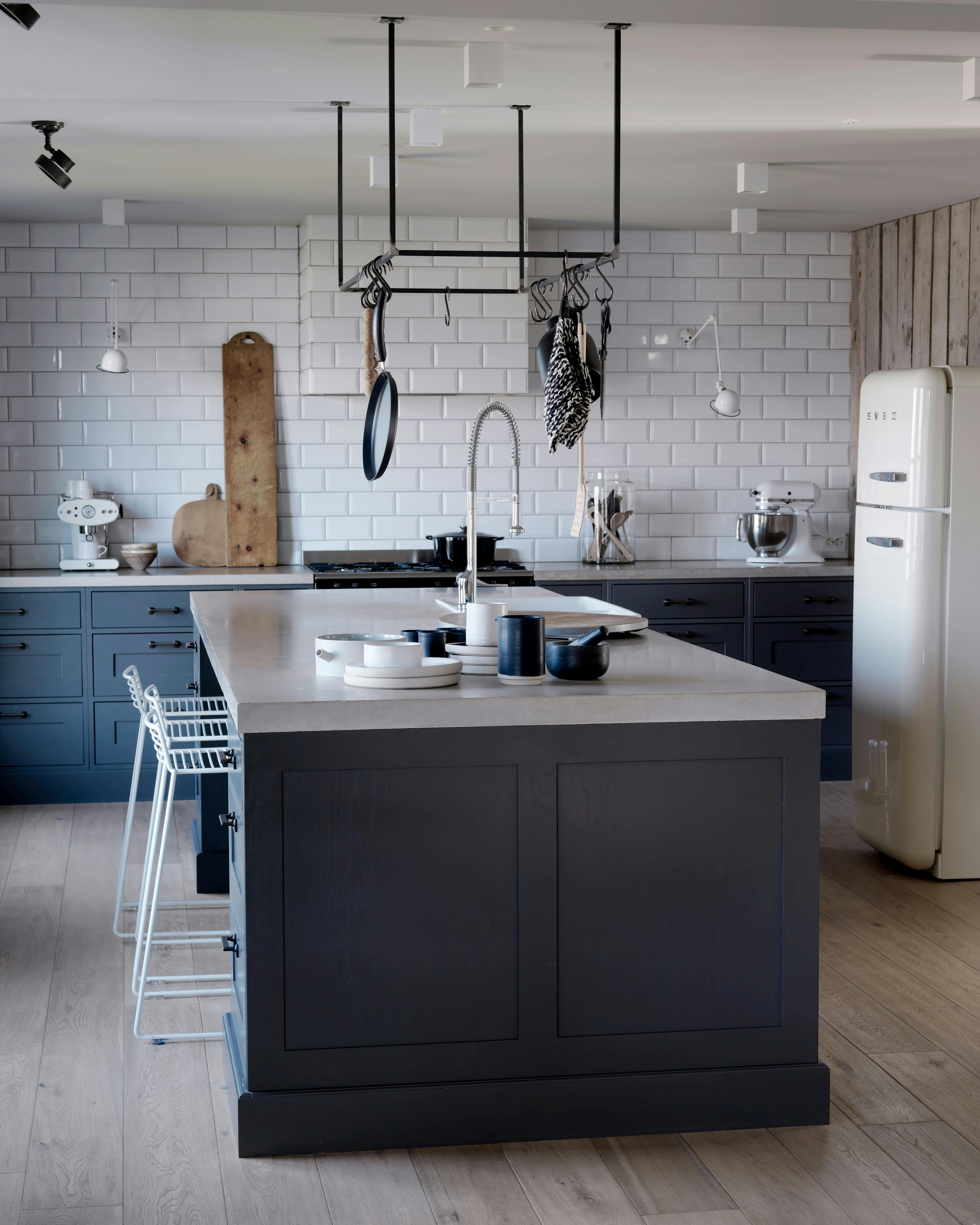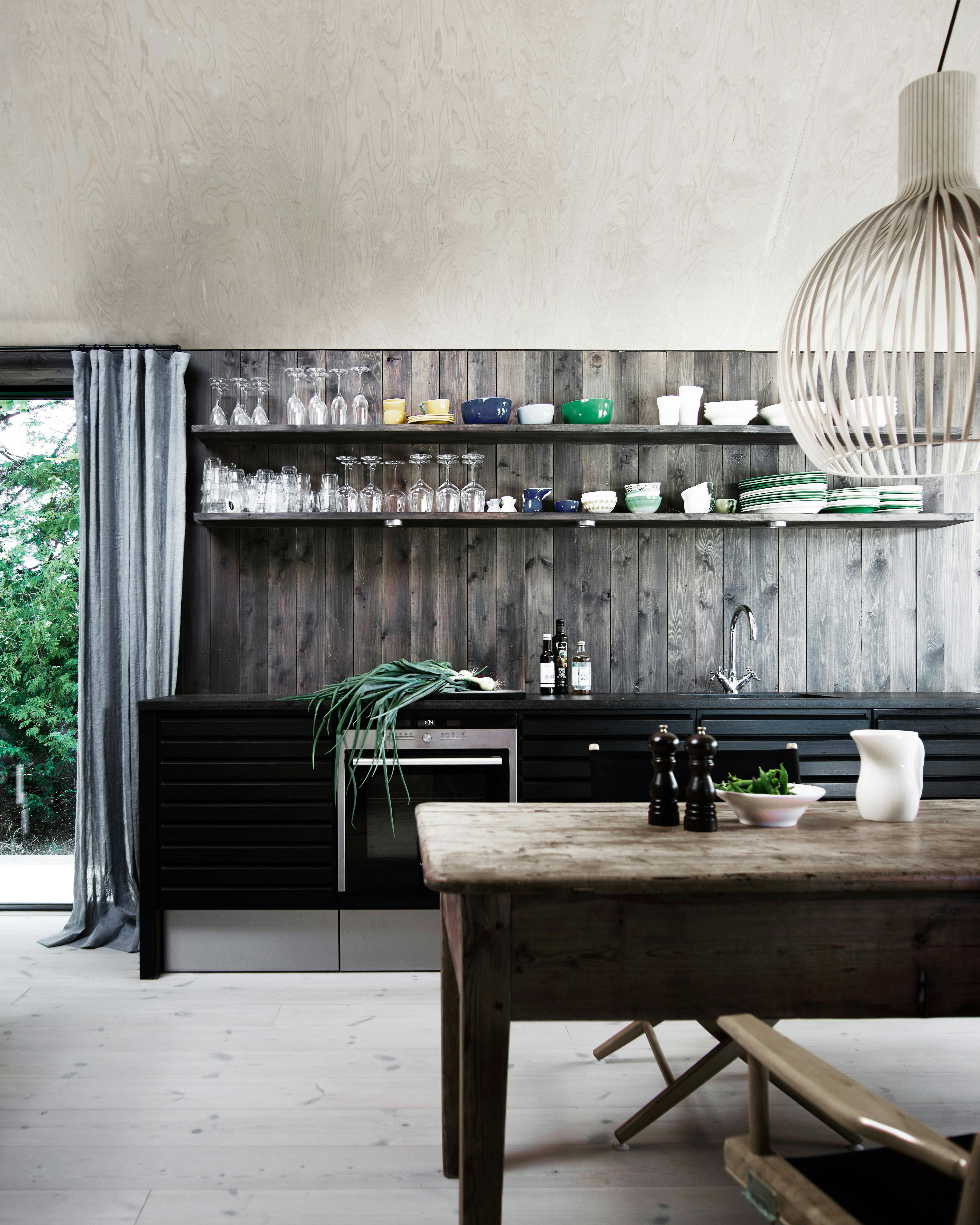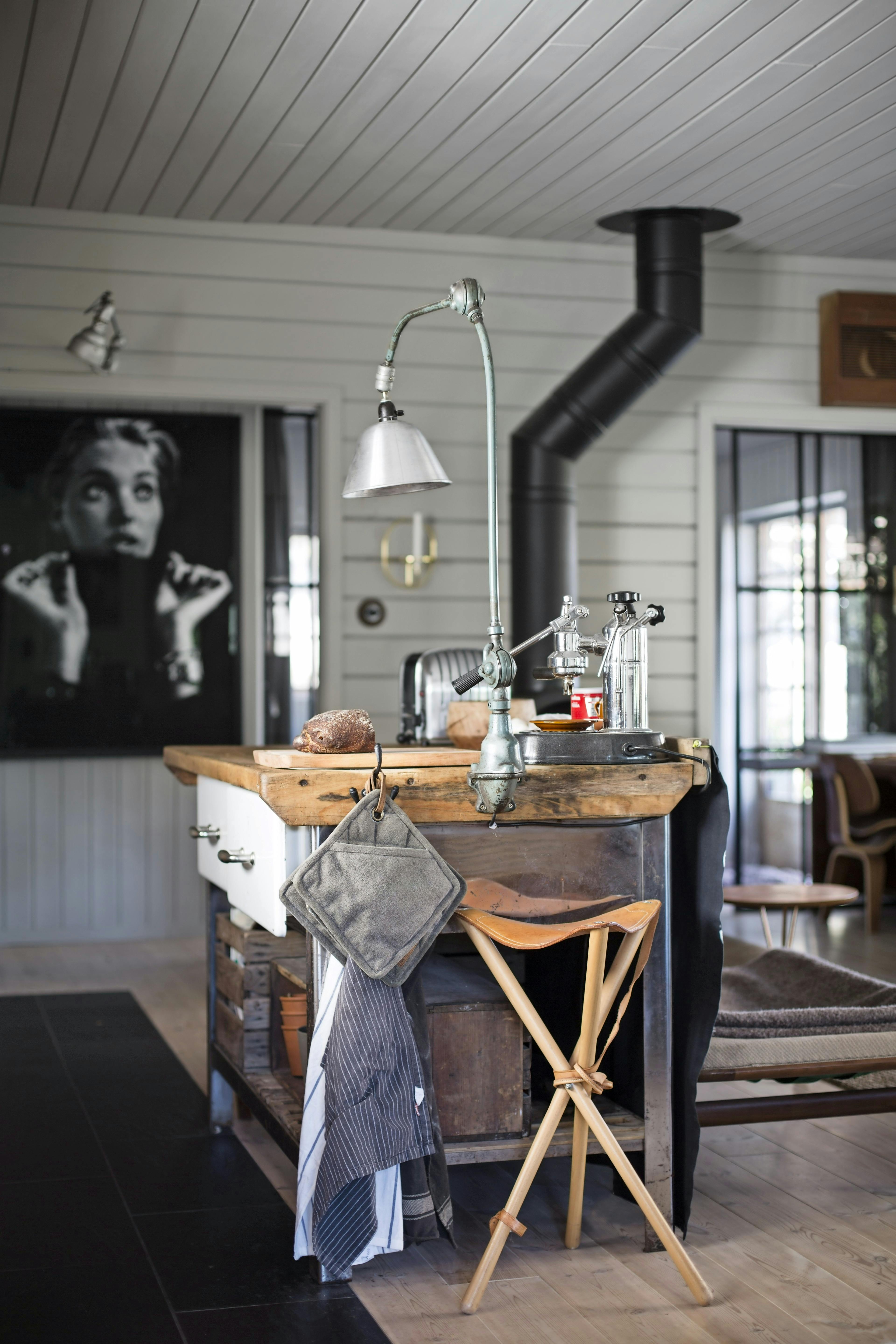 Med mange kroge og gamle trækasser på køkkenøen kan du give dit køkken-alrum et industrielt look.