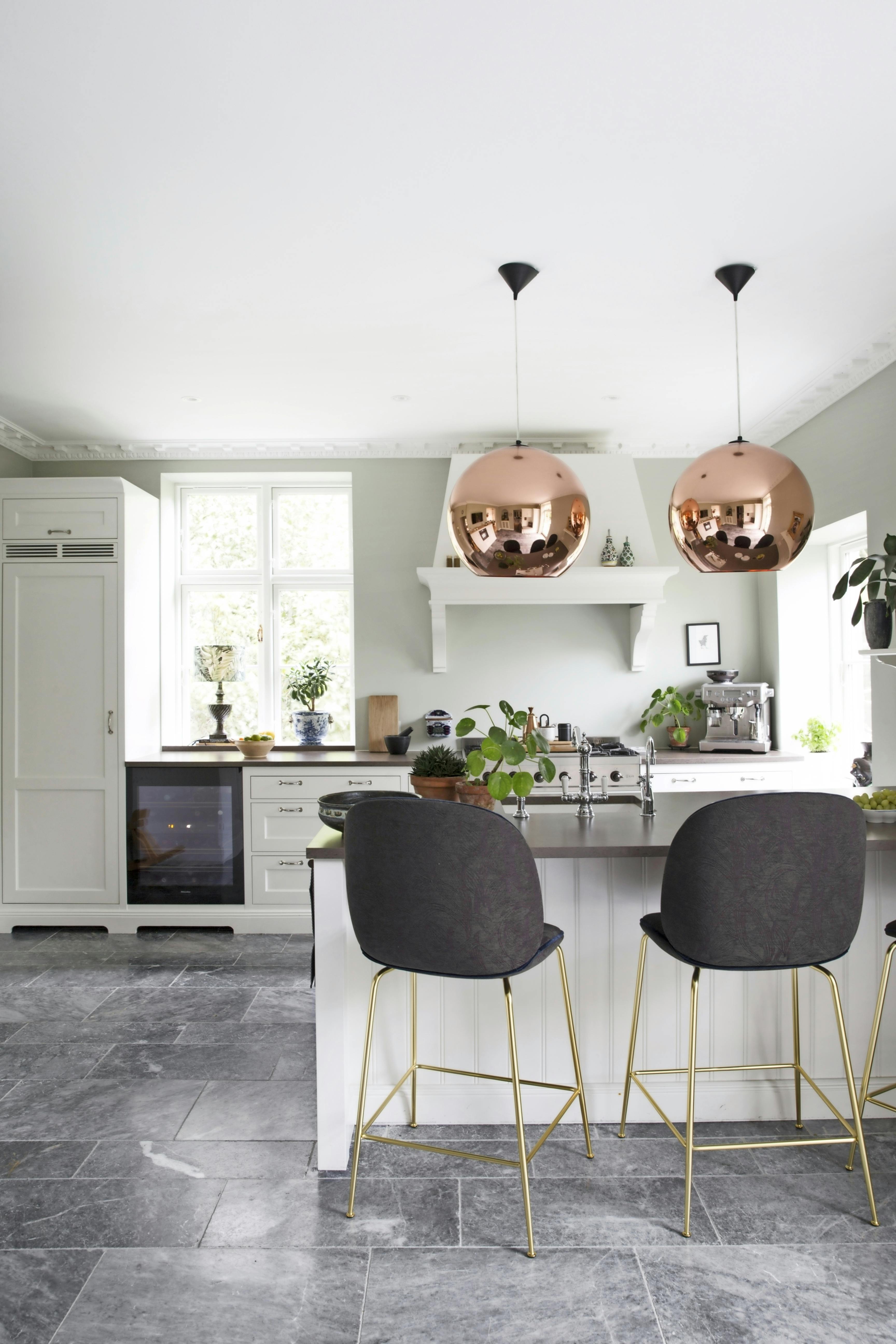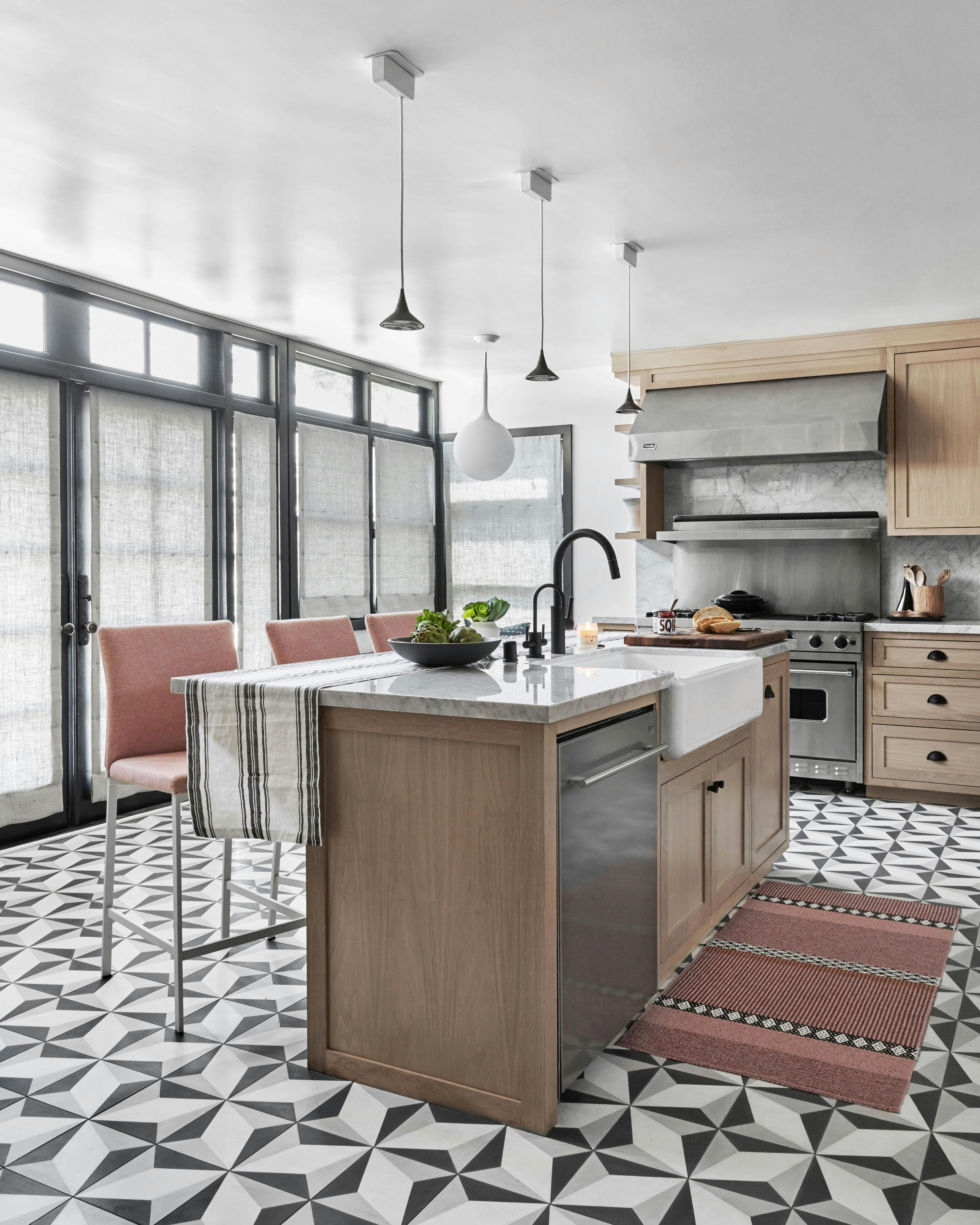 Inddrag art deco-elementer i dit køkken-alrum ved at lægge grafiske fliser på gulvet som her på billedet. Hvis du synes, at fliserne virker for kolde kan, kan du tilføje tekstiler i støvede, varme farver som fx et tæppe. Er du vild med fliser i køkken-alrummet, kan du også nøjes med et back-splash i fliser.