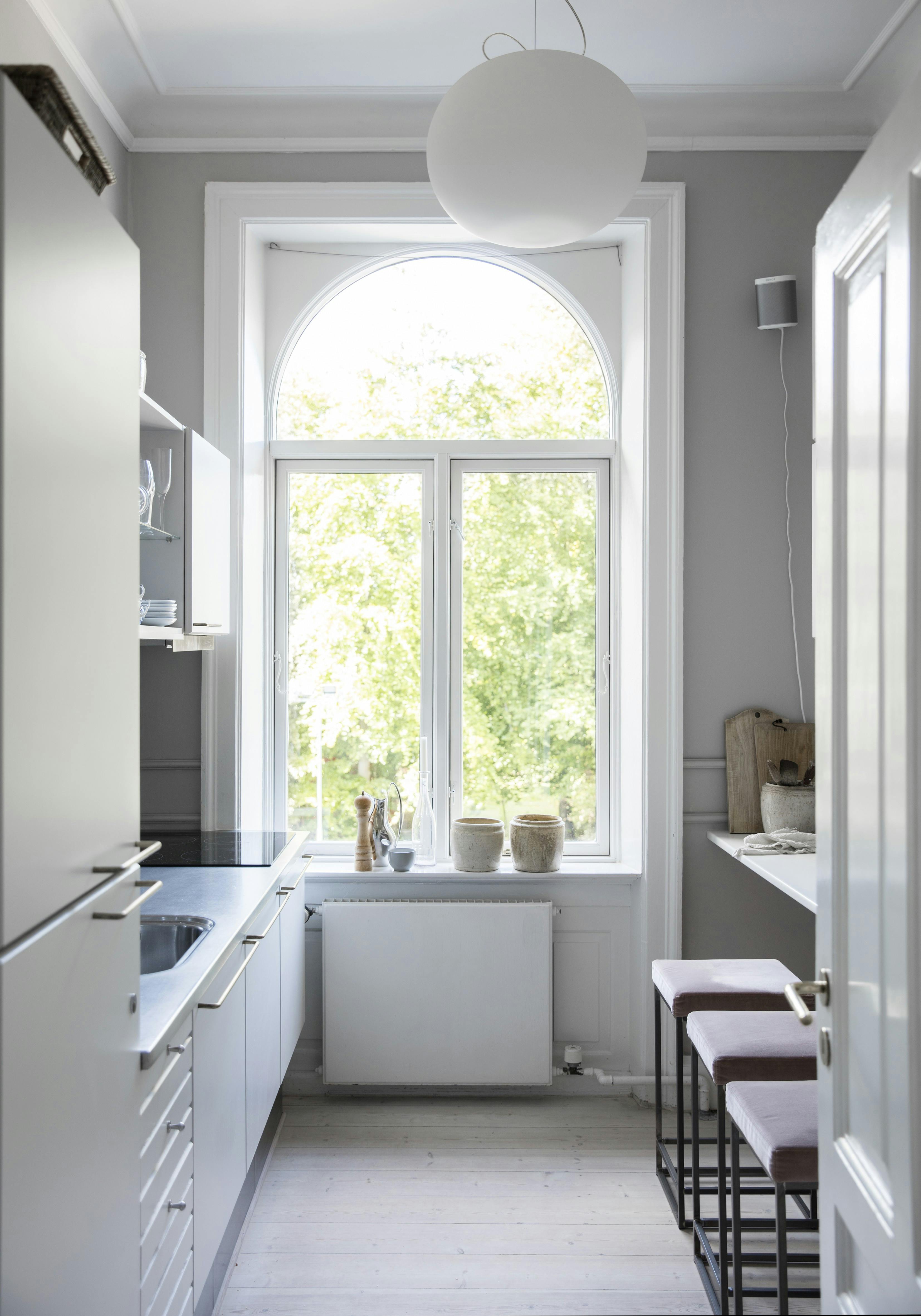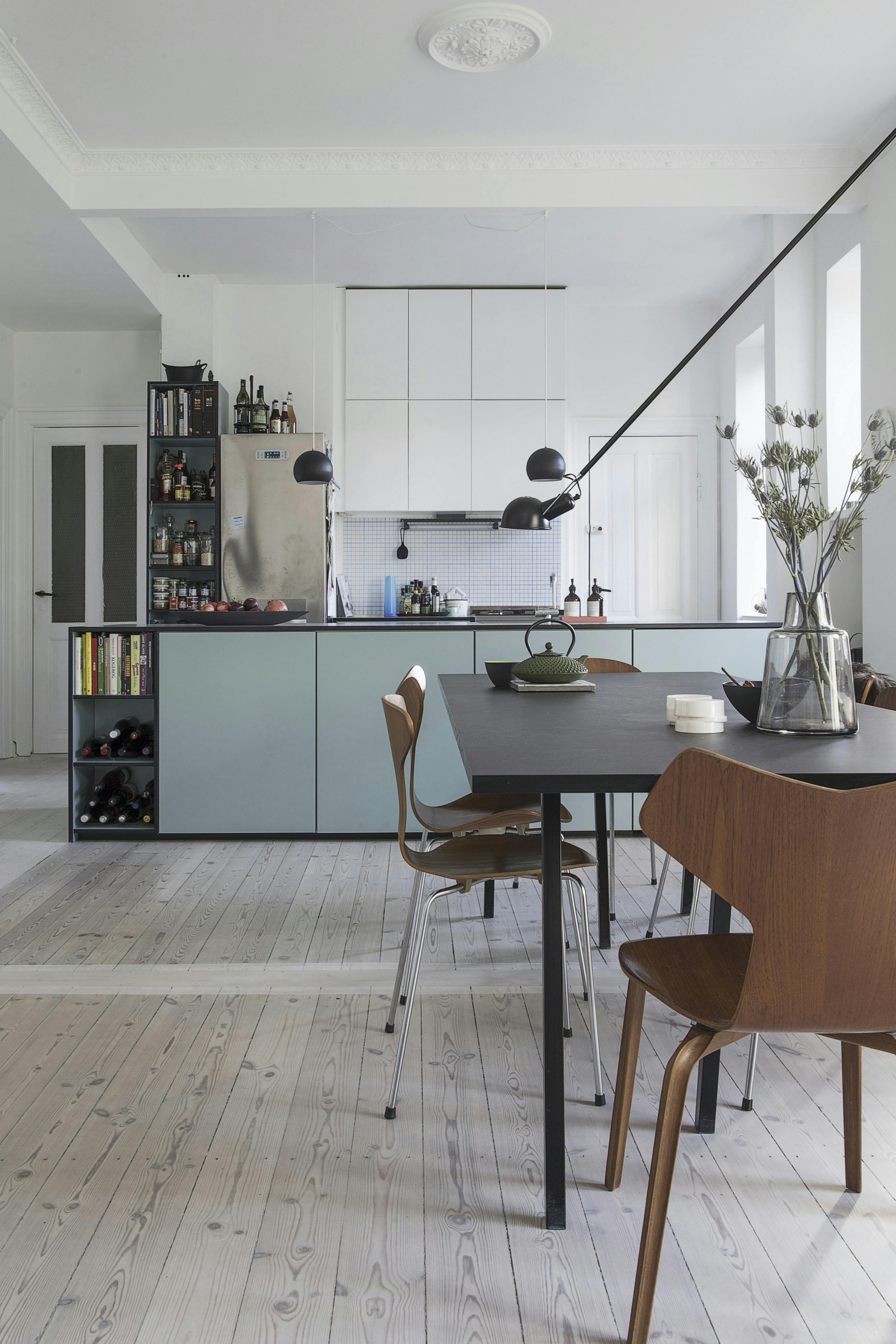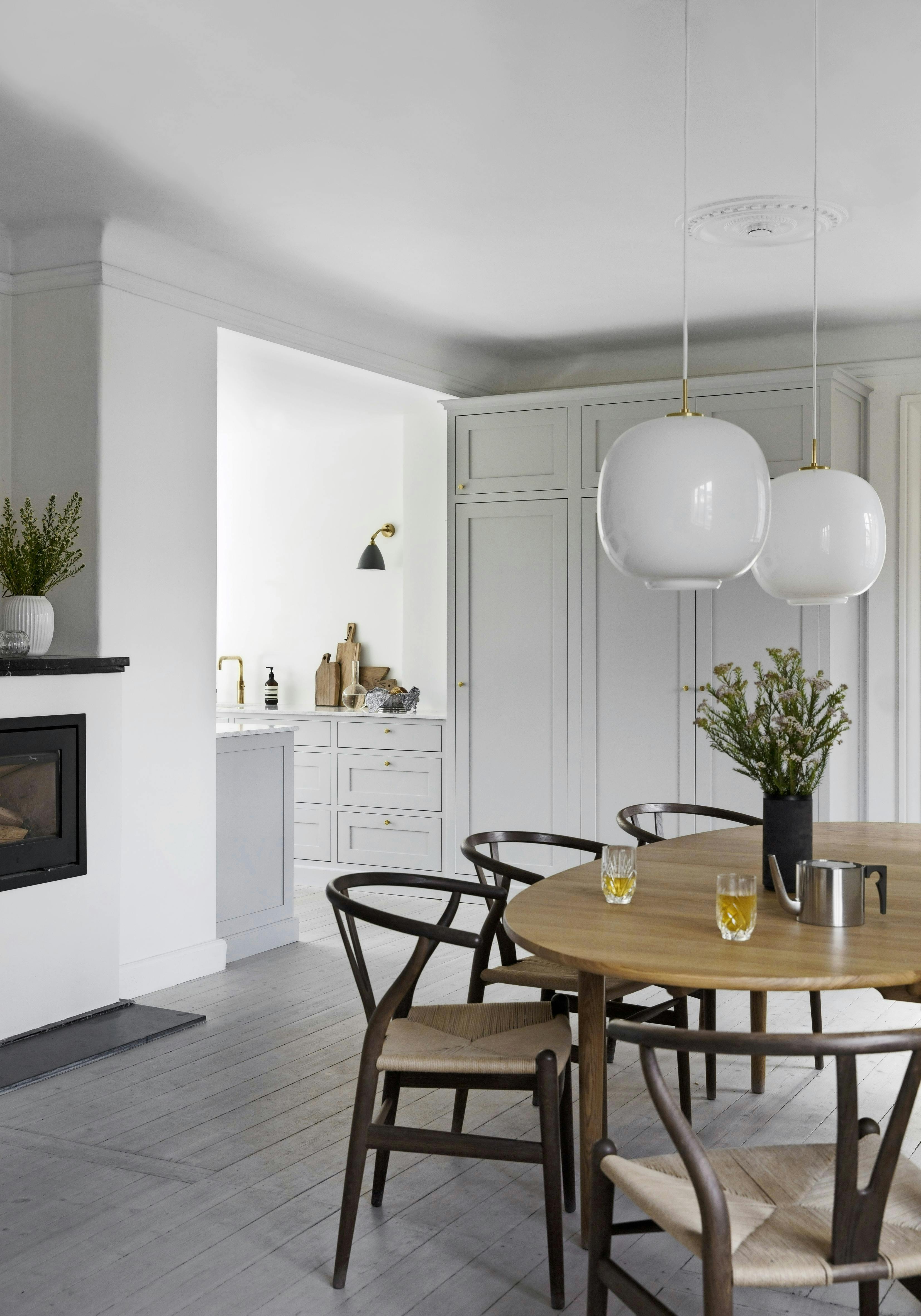 Bor du i en ældre bolig, kan det være, at du bliver nødt til at omstrukturere plantegningen og lægge nogle vægge ned, for at skabe et køkken-alrum. Det har man valgt at gøre i dette hjem, hvor køkken og spisestue nu er forbundet. Her fungerer det fint, at køkkenet går i et med spisestuen, men at man lige skal rundt om hjørnet - det skaber zoner, som kan være rare, hvis du gerne vil have en smule adskillelse til hverdag.
