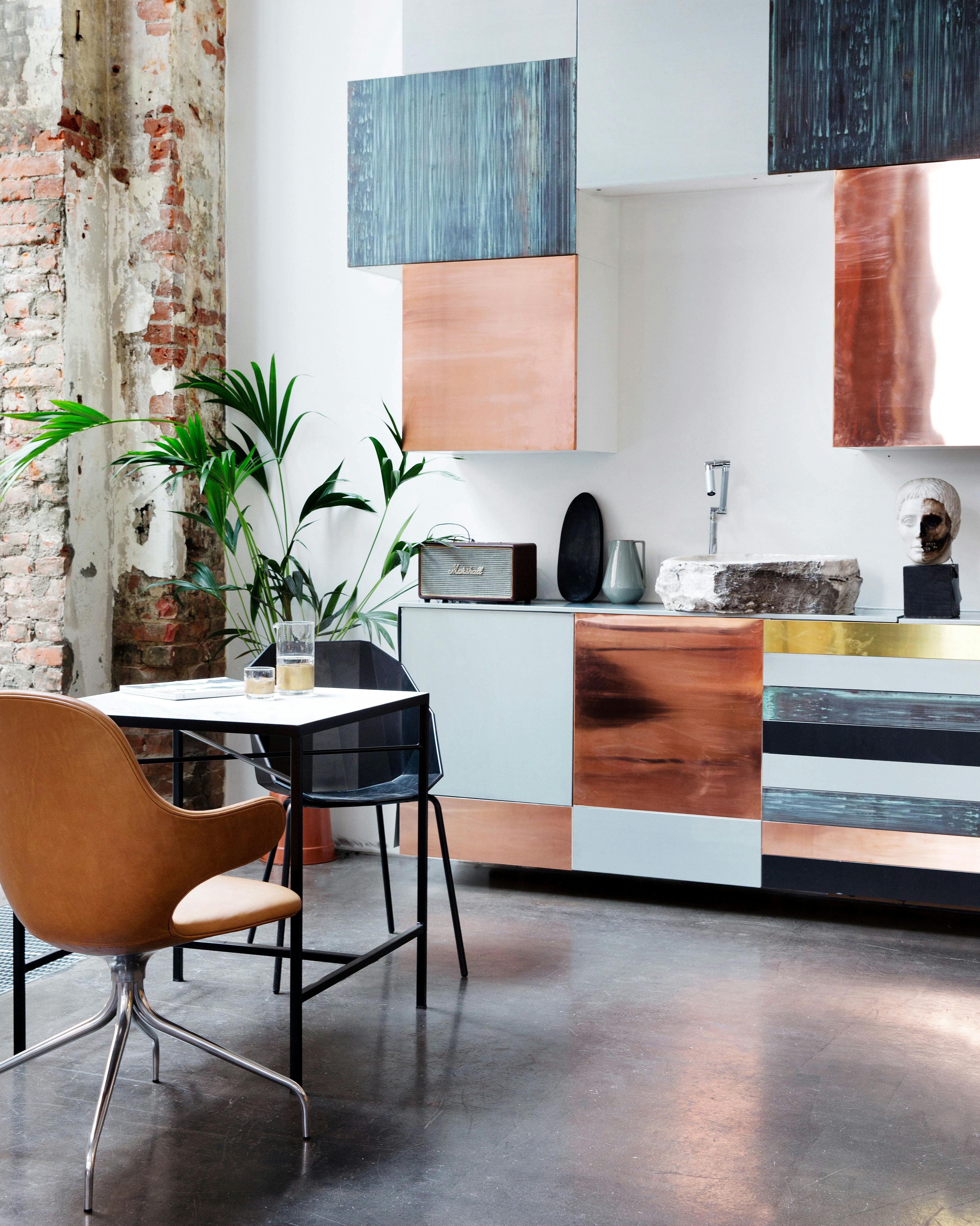 Her er et køkken-alrum som kan tåle at blive brugt! Skab et køkkenværksted som har med materialer i marmor, træ og kobber, der kan tåle at blive brugt og med tiden får en flot patina. Vil du have et køkken alrum med masser af personlighed, så er åbne hylder til dig! Du kan altid skifte rundt og bytte ud, når du trænger til farve- eller formskifte på hylderne.