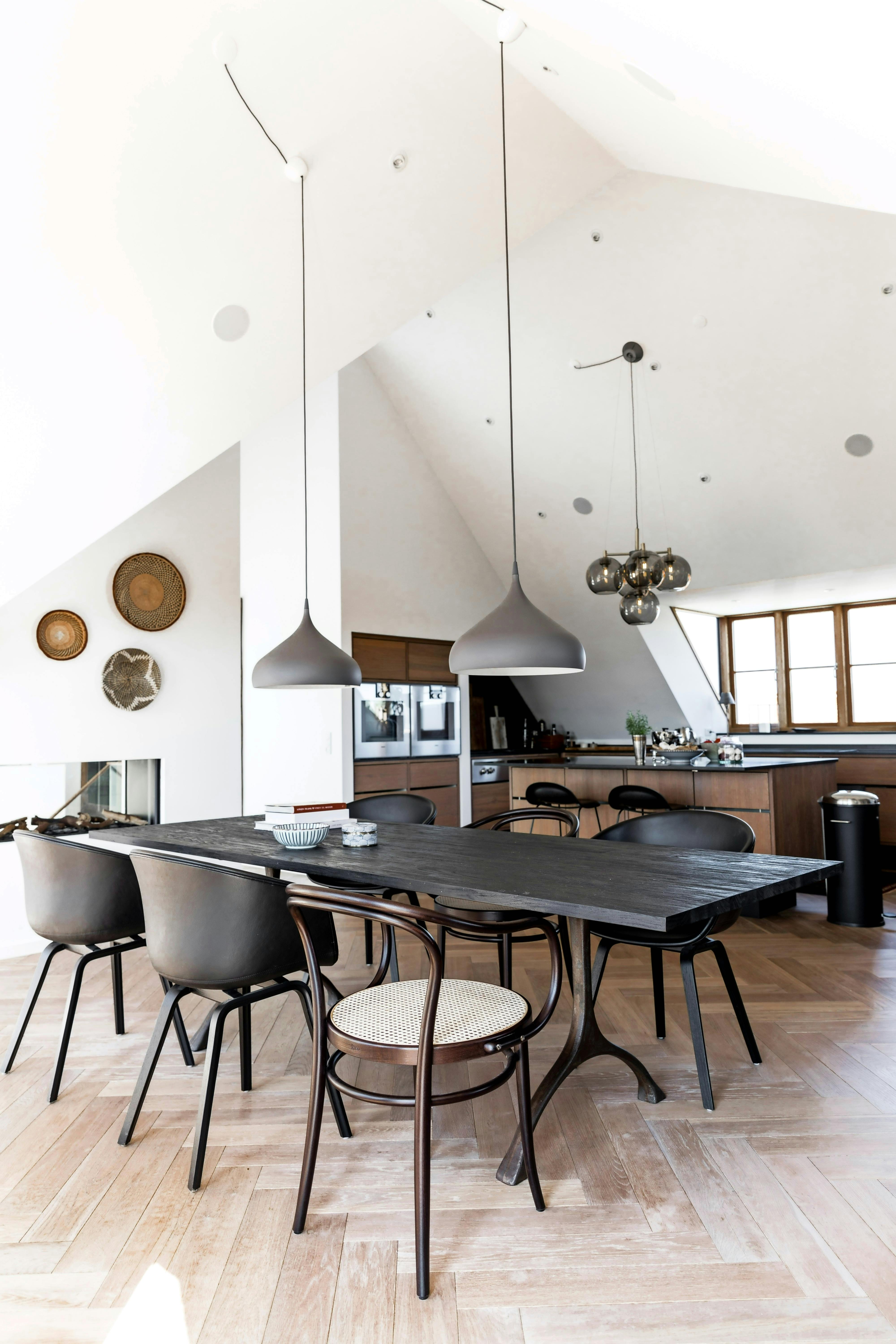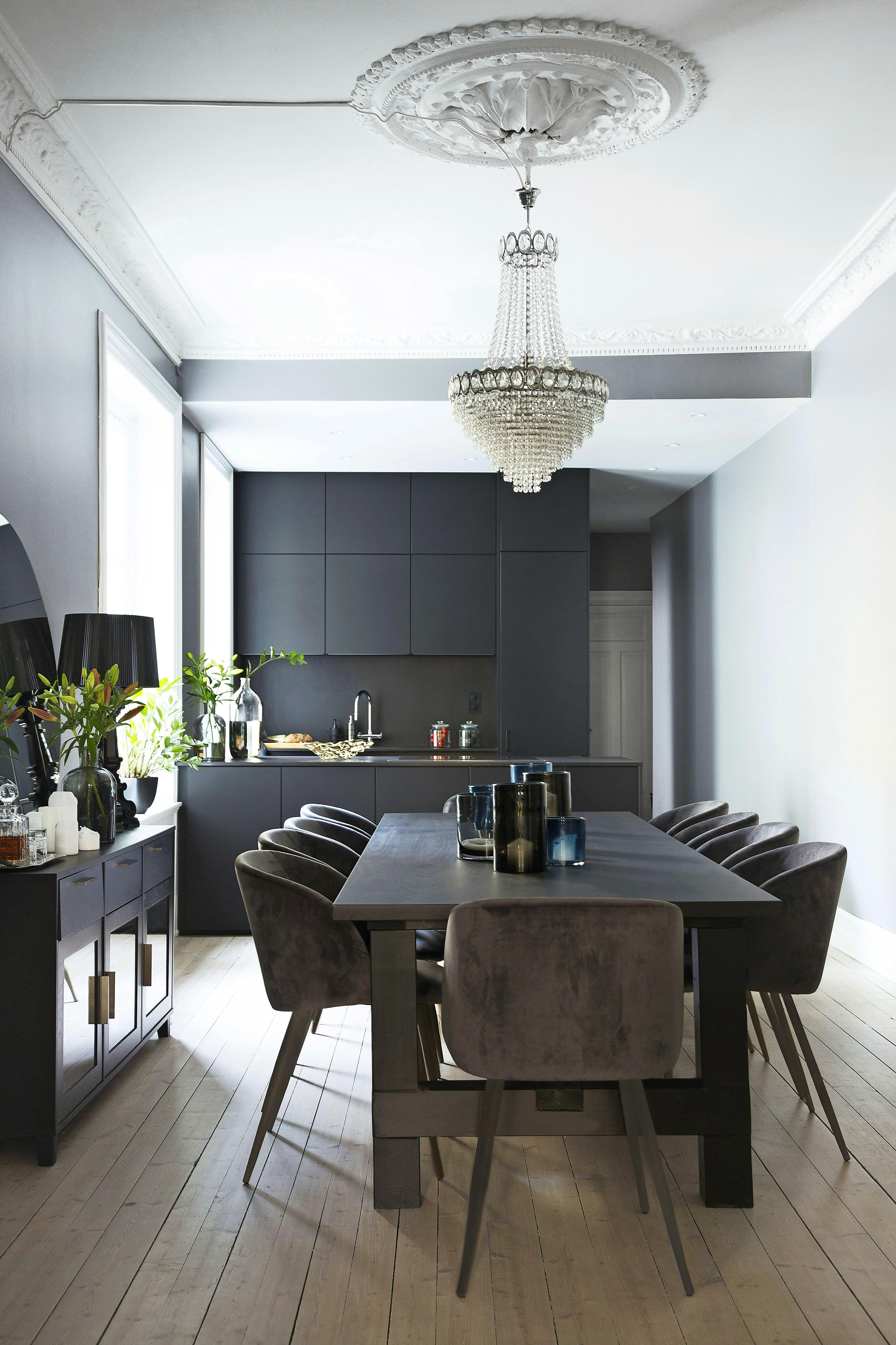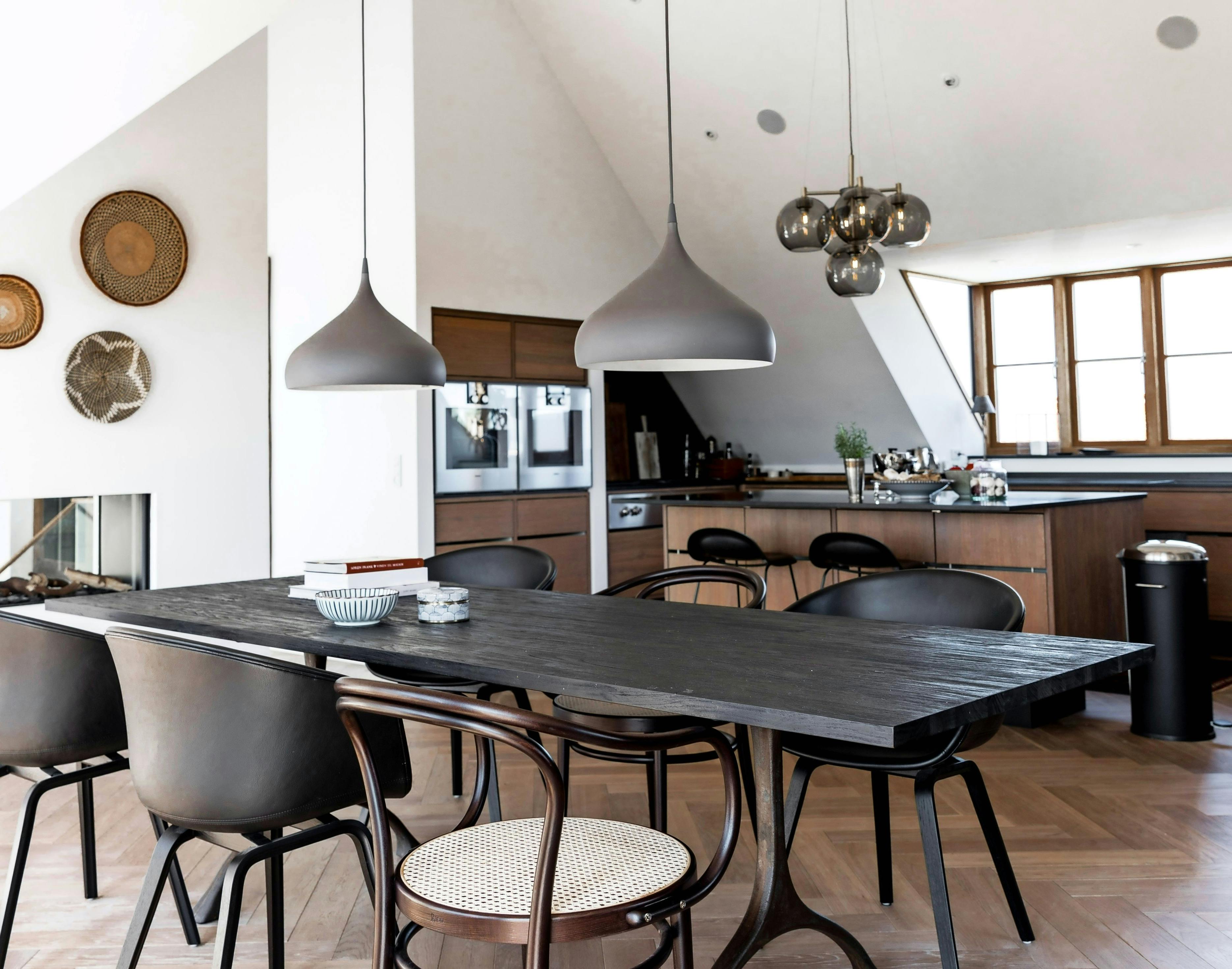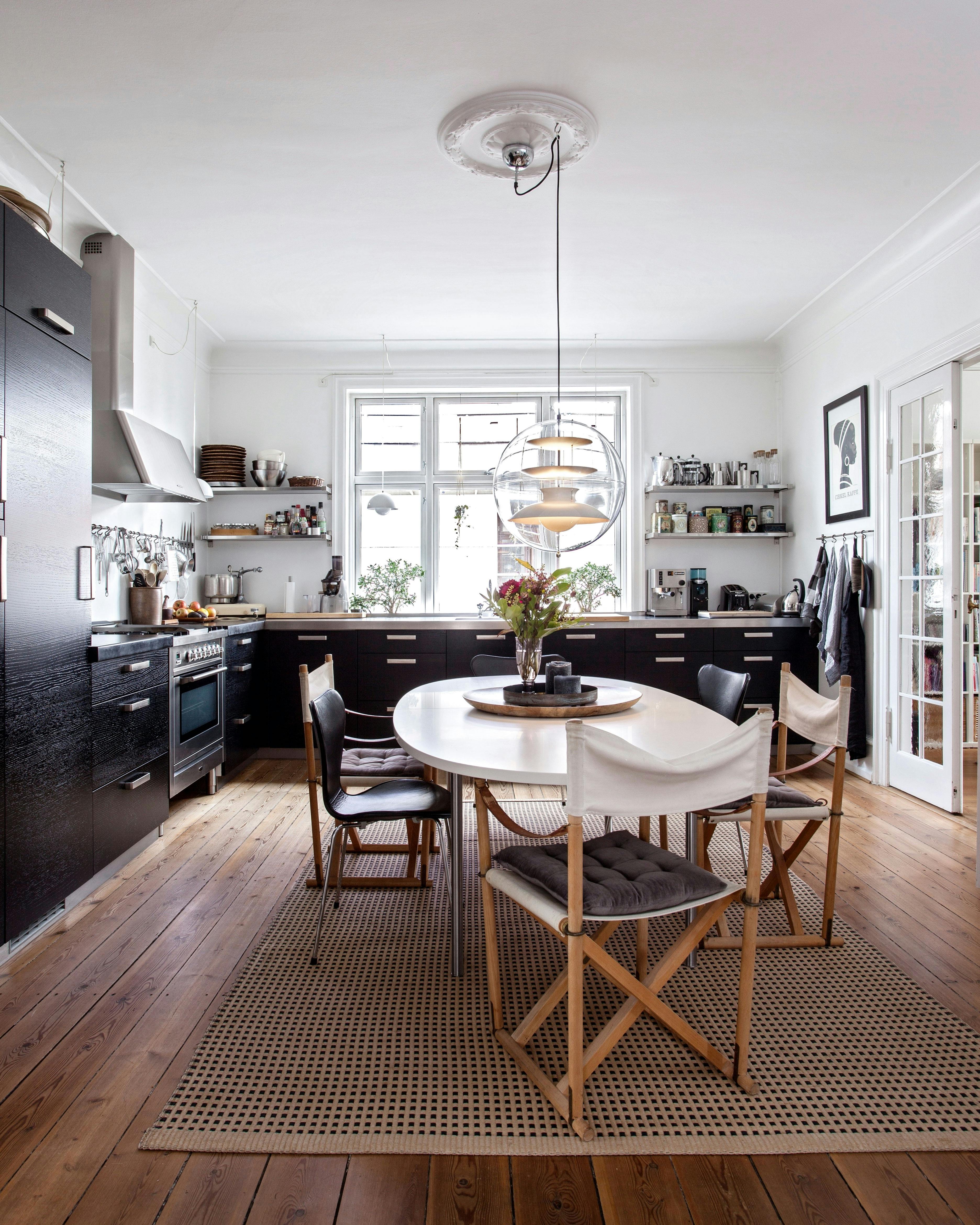 Er dit køkken præget af lyse farver, og er dine gulve og vægge hvide, så kan du skabe kontrast ved at indrette køkken-alrummet med et mørkt spisebord og spisebordsstole. Man ser i dag mange lejligheder, hvor der er fjernet en væg, så der er plads til køkkenalrum - men det kan alligevel knibe lidt med pladsen. I så fald er det en god idé med et rundt bord i alrummet, så du nemt kan 'klemme' ekstra gæster ind til middag.