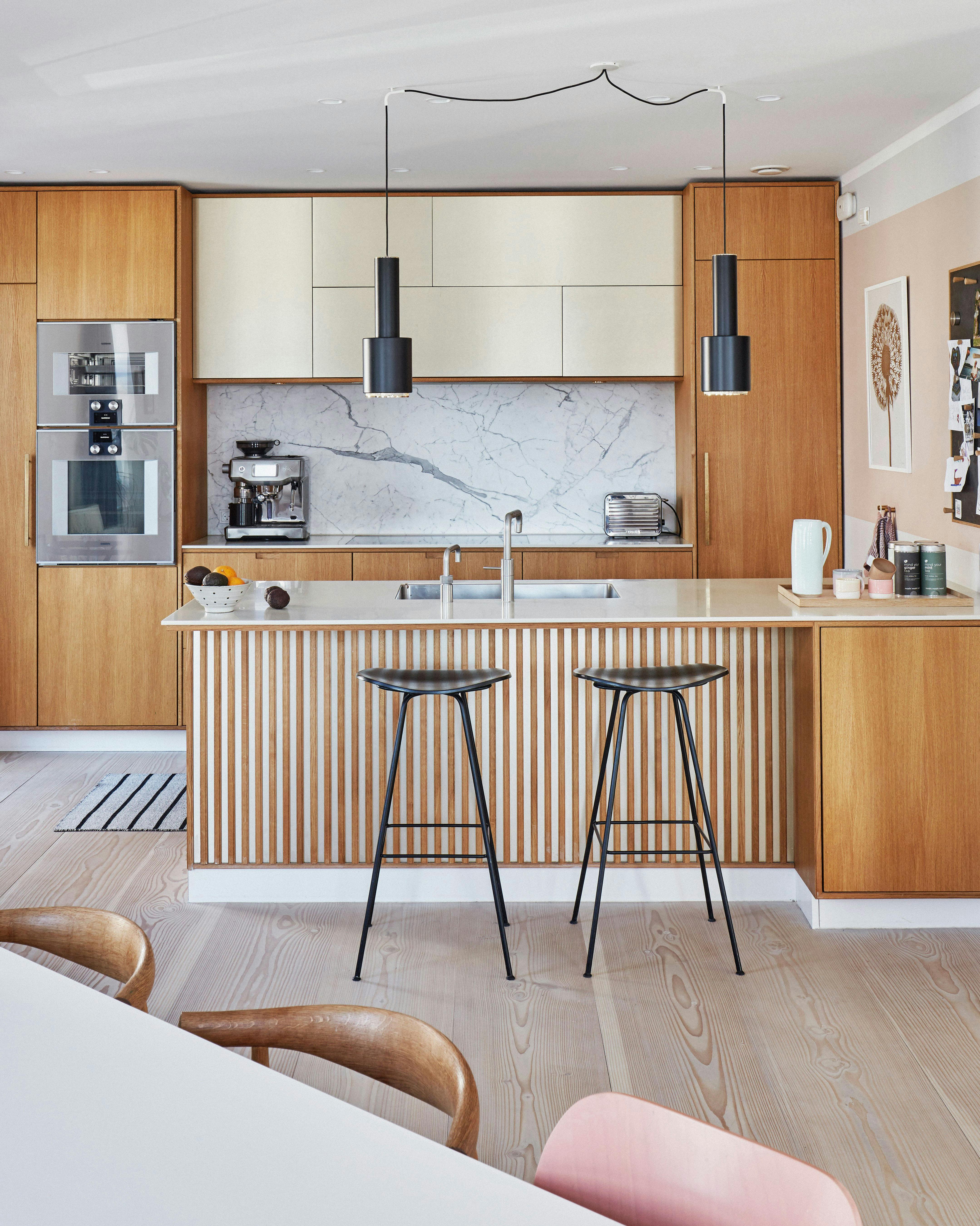 Har du et trækøkken som bærer præg af lyse farver, kan du bryde det med mørkere farver, som her hvor de sorte lamper og barstole giver kant og liv til køkkenet.
