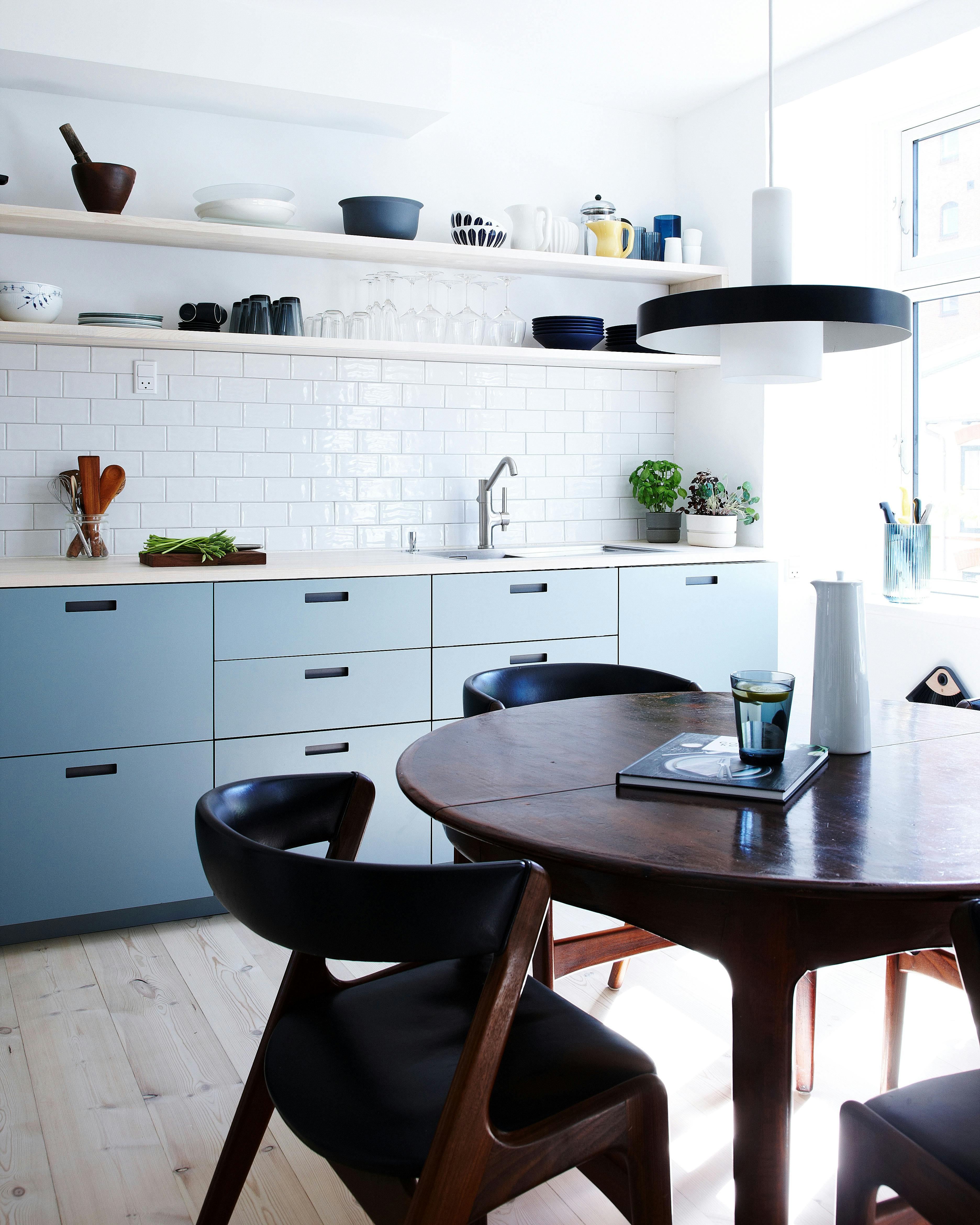 Her har man valgt åbne hylder frem for overskabe, hvilket giver liv til et enkelt rum. Samlingspunktet er skabt i midten af rummet i form af et vintage spisebord, som skaber en afslappet kontrast til det nye køkken.