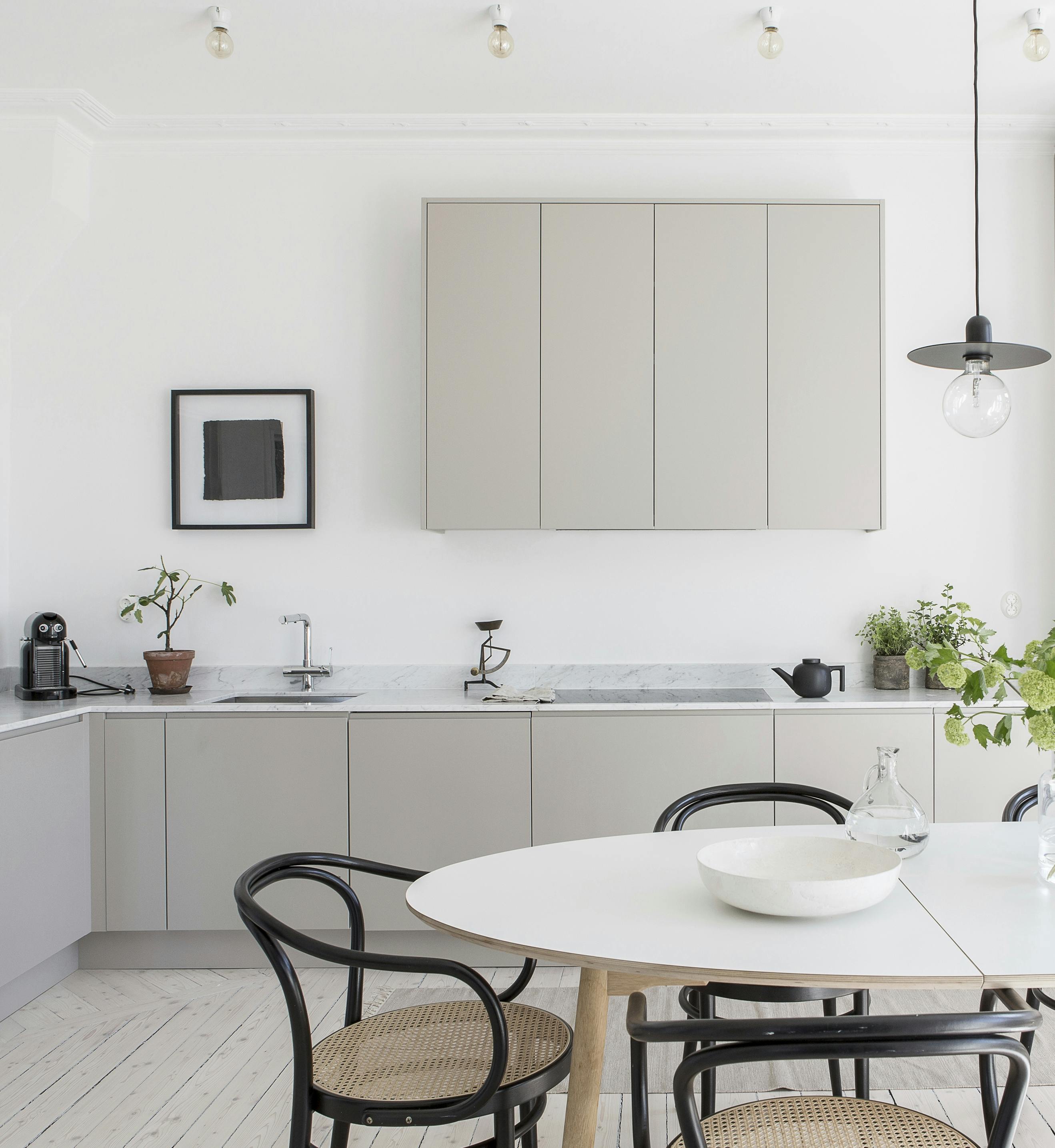 Her er der valgt et køkken med push-open funktion på alle skabe og skuffer, som giver køkkenet et minimalitisk og elegant look. Når du vælger et minimalistisk køkken-alrum som dette, er der også altid 'plads til' at tilføje detaljer i farver, som hurtigt kan skiftes ud, når du lyster.