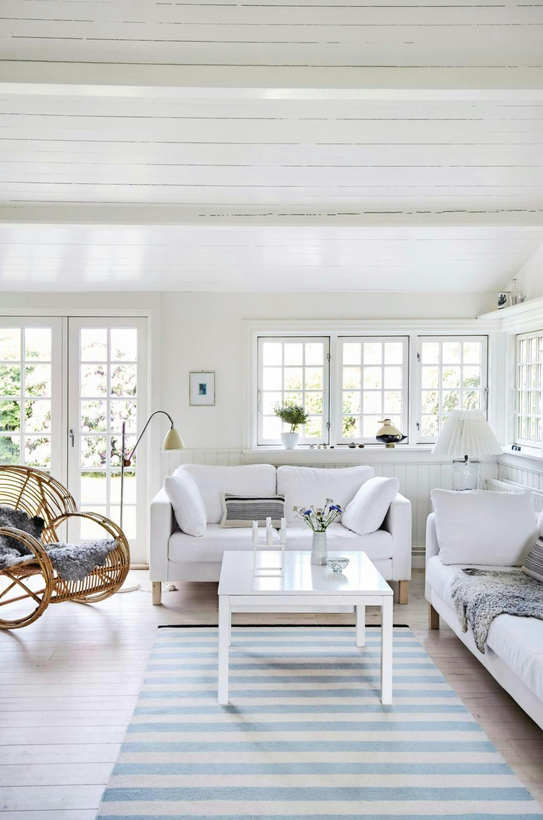 I huset er der loft til kip, hvidmalede træpaneler, som går halvvejs op ad væggen, småsprossede vinduer, kludetæpper, puder og smukt interiør, der er med til at understrege sommerhusstilen.