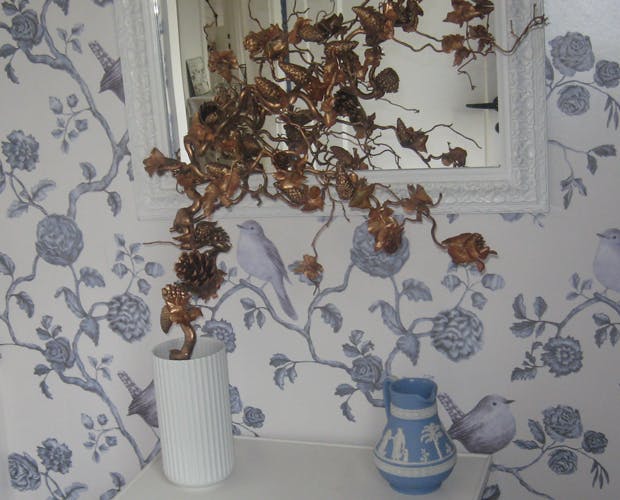 Hilsen fra Karina: "Så er der fyldt noget i Lyngbyvasen, ikke nødvendigvis det blivende, men dette var min første idé. Jeg har limet Hortenciablomster og kogler på en troldegren og givet den kobberspray."