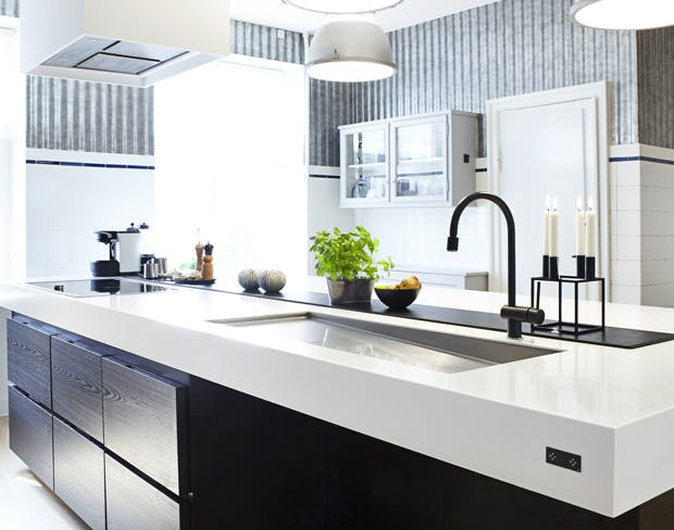 Lad dit køkken shine med hvide toner. Lyse farver i boligen giver som bekendt en fornemmelse af mere rumlighed, men det betyder ikke, at du ikke kan bruge mørke nuancer, når du indretter. Et hvidt gulv kan få gulvfladen til at virke større og sætte ekstra fokus på et køkken, hvor eksempelvis sort er et gennemgående tema. Omvendt kan et hvidt køkken med hvide vægge få ekstra opmærksomhed med en væg i en mørkere tone.