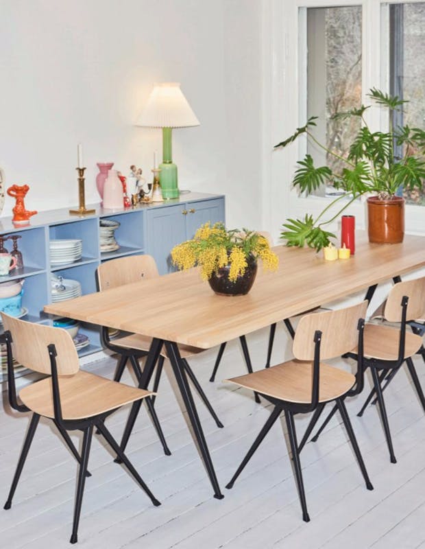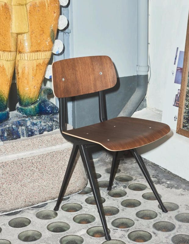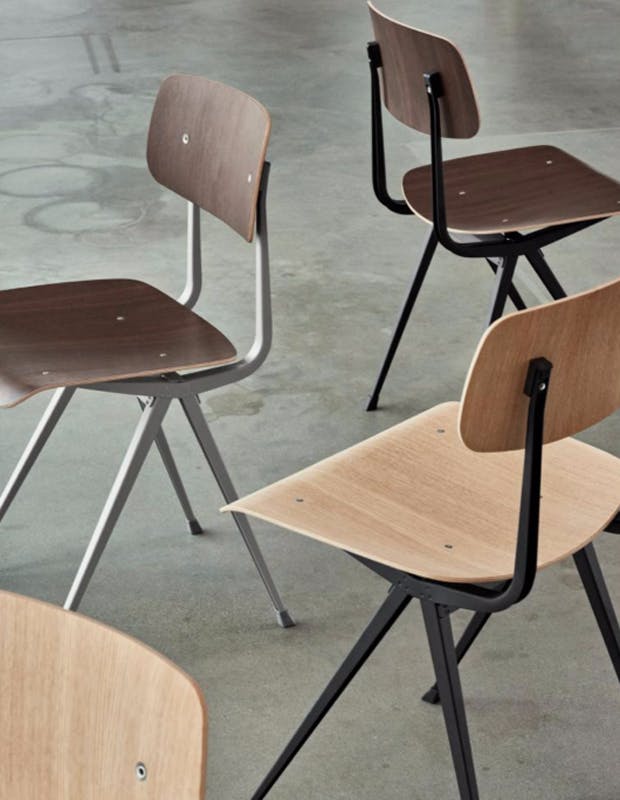 Stolen Result så dagens lys i 1958, hvor den blev designet af Friso Kramer og Wim Ritveld. Den blev hurtigt en succes i private hjem såvel som i skoler. HAYs relancering af stolen kommer i 8 forskellige versioner - med variation i farve på stel og ben, og de er smukke at kombinere på tværs af forskellighederne. Stolen er i stål og træ, og stilen er industriel og enkel, og kan derfor passe ind i næsten enhver boligstil.