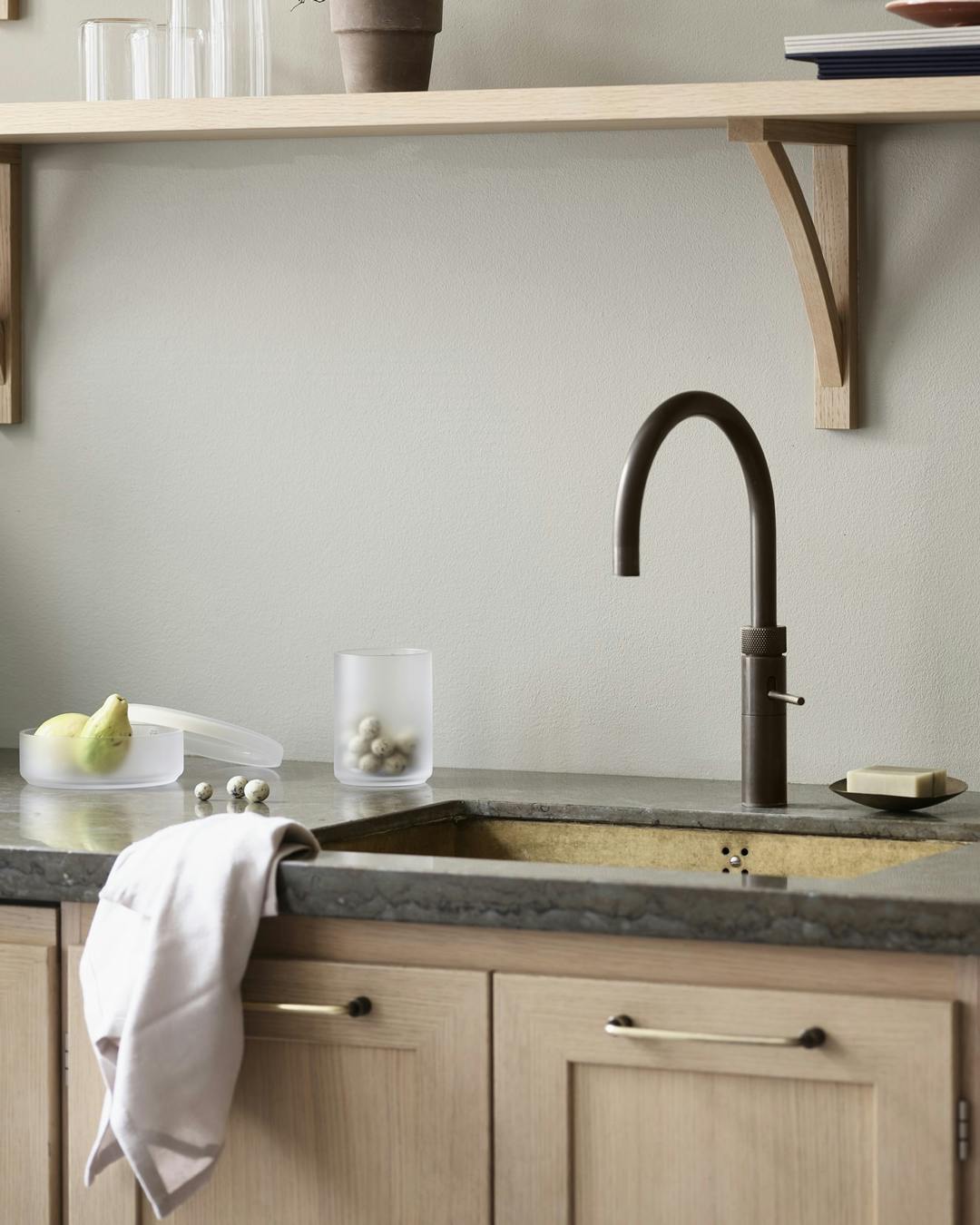Den rundt og organiske form er med til at bløde køkkenets udseende op. Armaturet her er fra Damixa, og designet skulle gerne lede tankerne hen på en smuk svane. Modellen hedder Venus.