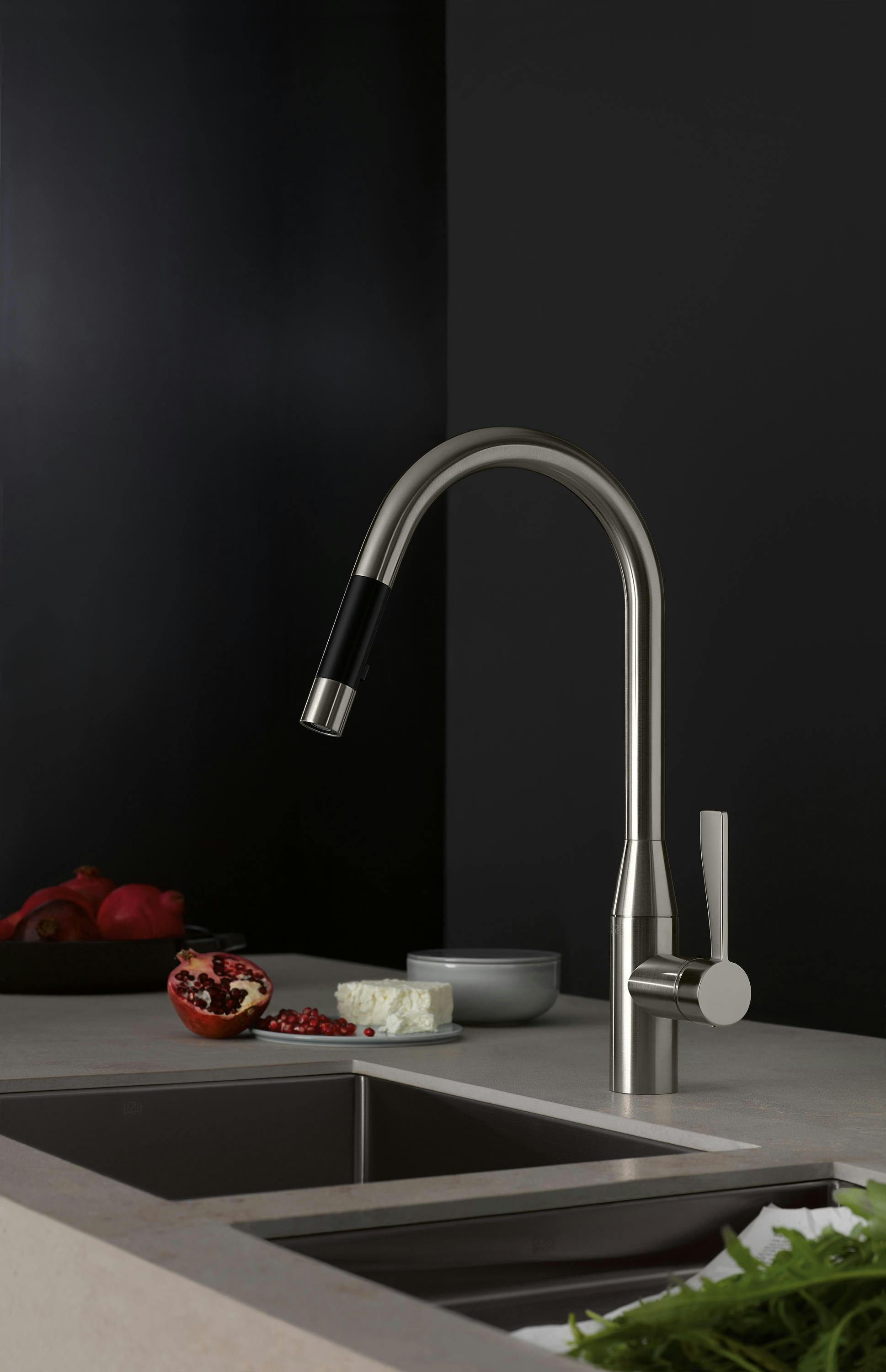 Det fleksible køkkenarmatur har navnet Sync og er fra tyske Dornbracht. Armaturet har to forskellige stråletyper, naturlig og kraftig, som kan bruges alt efter behov.