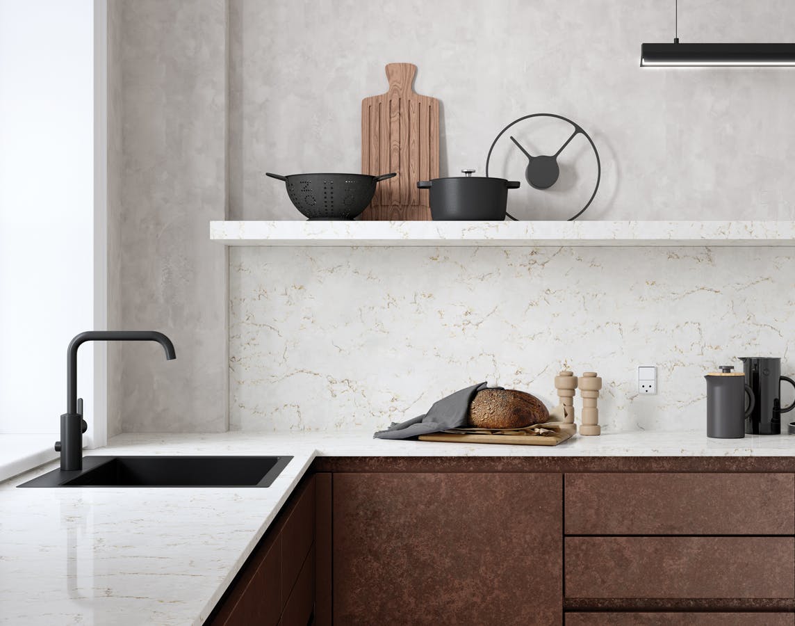 Er de bærende elementer i rummet lyse, såsom skabene eller væggene, kan det sorte armatur skabe en kontrast til det lyse rum. Ellers suppler med andre sorte eller mørke elementer, så rummet bliver mere gennemført. Husk, vælger du et sort armatur i køkkenet, skal du ofte tørre det af, så der ikke danner sig hvide kalkpletter.