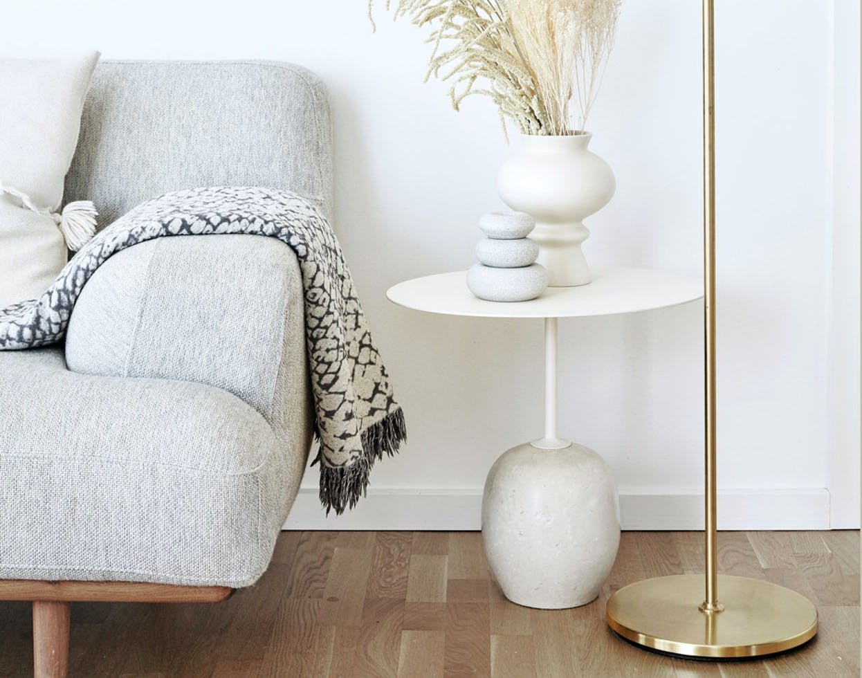 I sofaområdet kan et sidebord give ekstra luft i rummet. Bordet fra &Tradition er flot indrettet med keramik og tørrede blomster. Hvis du mangler noget, der giver lidt højde i rummet, kan du placere en gulvlampe ved siden af som her.