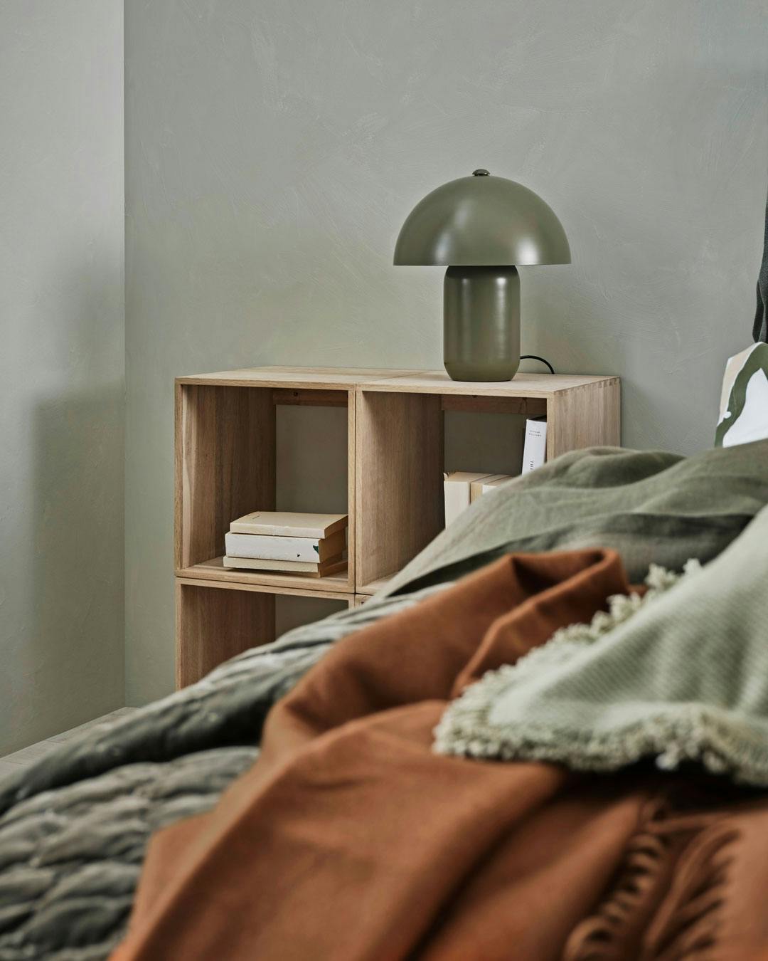Opbevaringsplads er en mangelvare i mange hjem, derfor gemmes ting og nips væk under sengen eller i hjemmets skjulte kroge. Optimér i stedet pladsen ved sengen, og lad en bogkasse agere både reol til opbevaring og sengebord. Dette kan hurtigt give rummet et nyt look. Bogkasse og lampe fra Jotex.