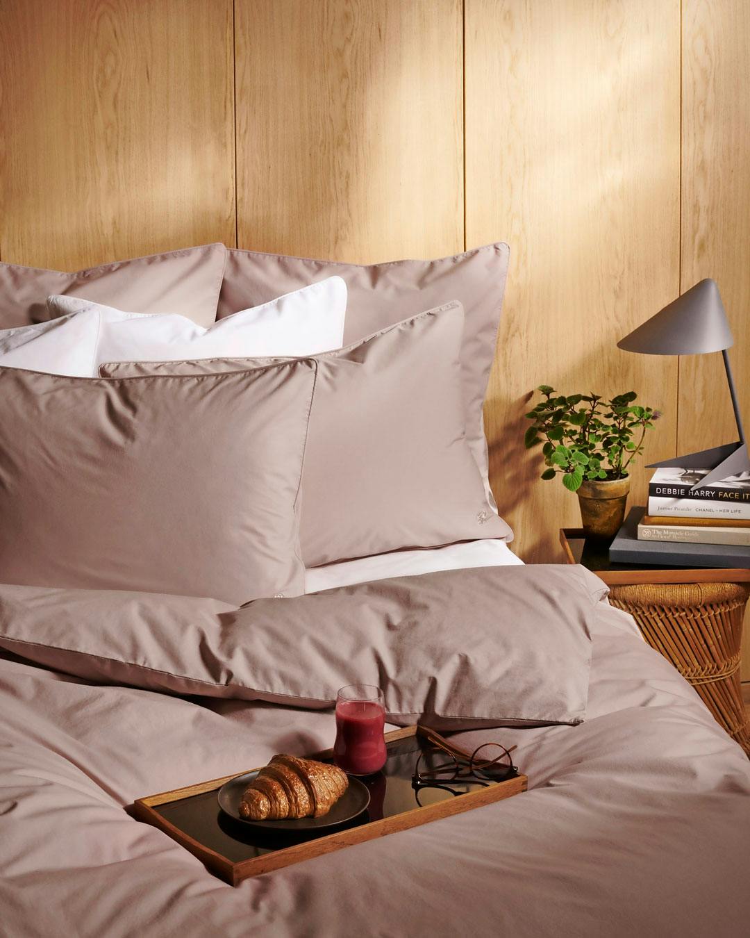 Fyld sengen med puder i bløde tekstiler. Gå efter puder i samme toner for at holde rummet roligt, da et hav af forskellige materialer og nuancer kan forstyrre øjet. Sengesæt fra Georg Jensen Damask.