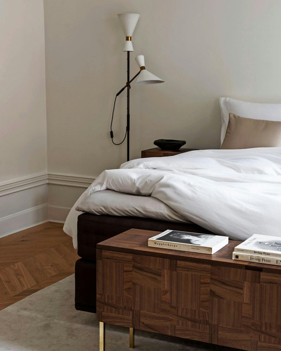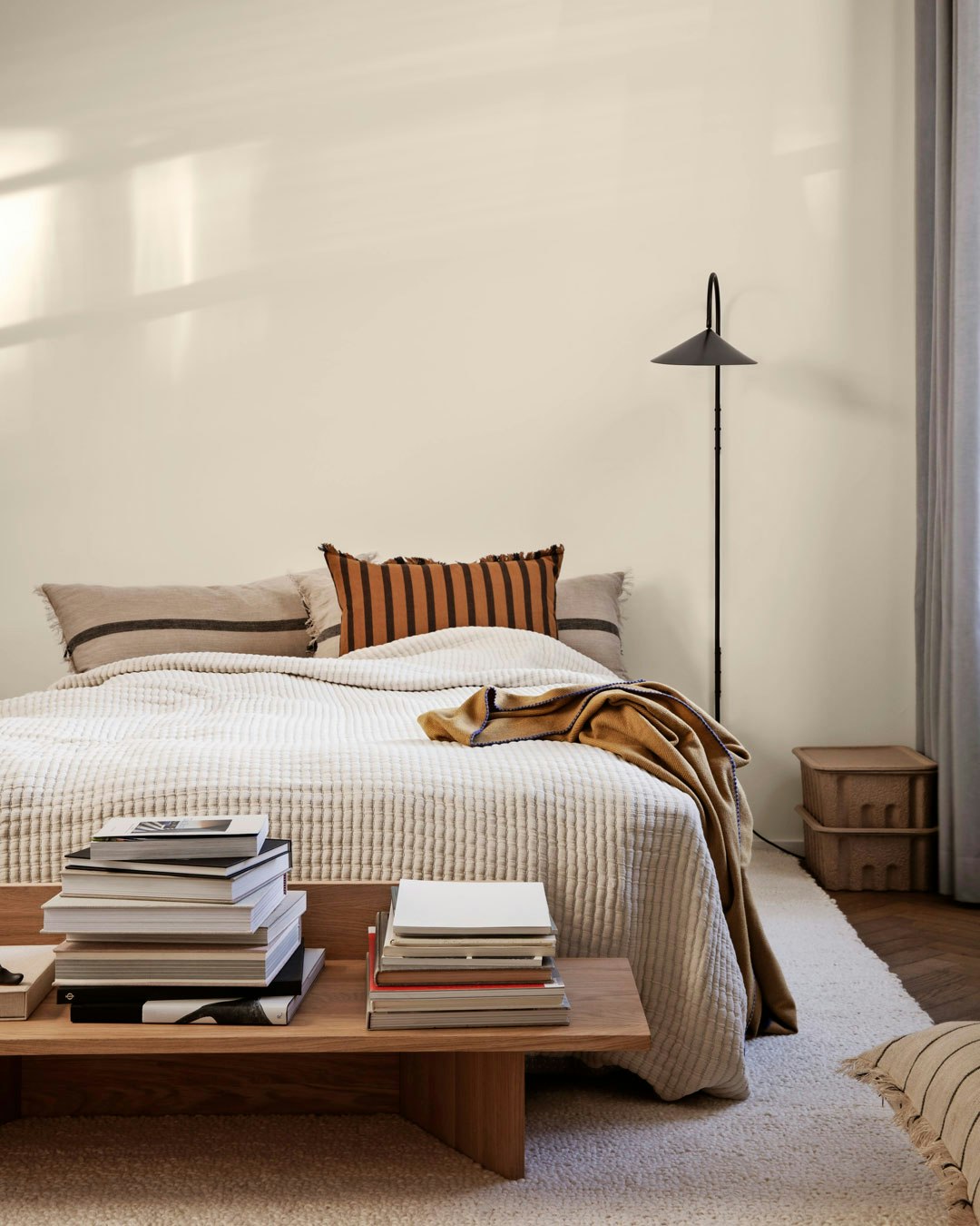 En smart og enkel opgradering er en bænk for enden af sengen, som både er praktisk og æstetisk: Sid på den, når du om morgenen klæder dig på, læg tøjet fra dig på den om aftenen, eller brug den til at udstille dine yndlingsbøger. Interiør fra Ferm Living.