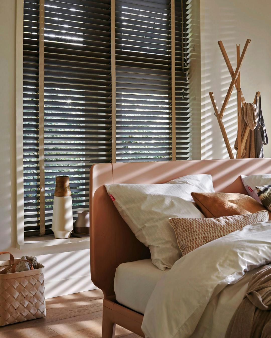 Den rette lysafskærmning kan være med til at sikre en god nattesøvn. Med mørke persienner får rummet en dunkel stemning, der indbyder til ro, og sørger for, at rummet bliver mindre klinisk. Træpersienner fra Luxaflex.