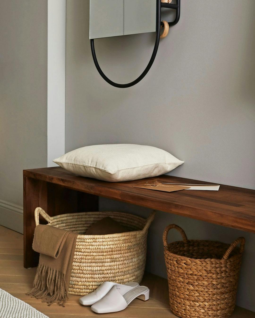 Soveværelset får et skud varme med en bænk i mørkt træ til at lægge tøj på. Gå efter flettede naturkurve til at opbevare dit vasketøj pænt oog diskret. Kurve fra H&M Home.