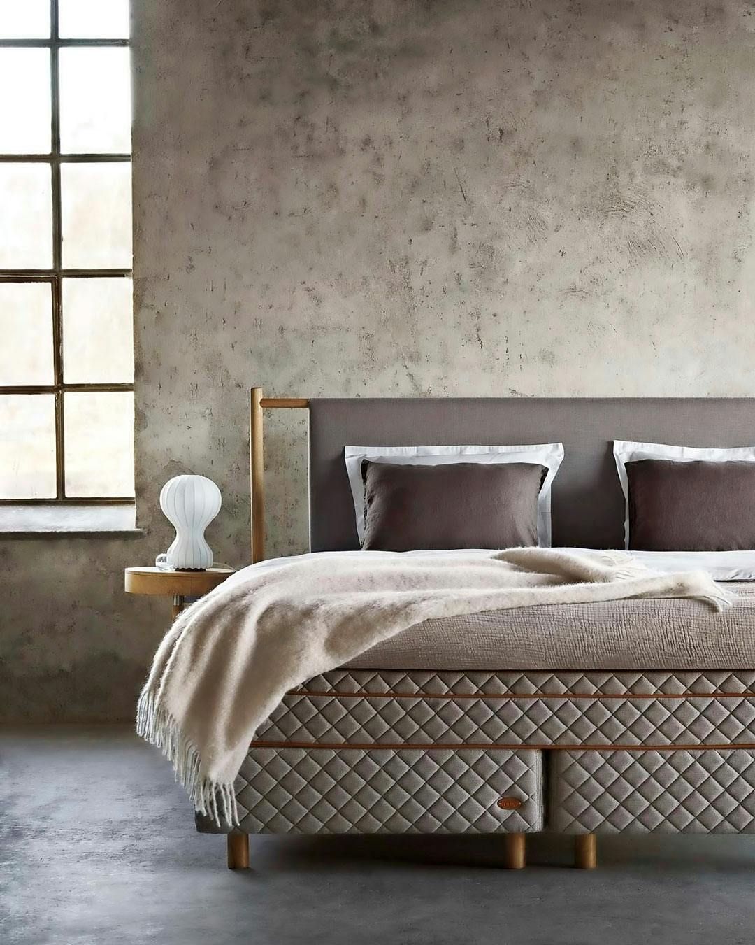 Som et alternativ til en standard natlampe, kan du investere i en standerlampe, der både kan lyse hele rummet op, men også rette lyset til det sted, det skal bruges. På den måde sikrer du en behagelig belysning at starte og slutte dagen med. Sengetøj og skænk fra Hästens.