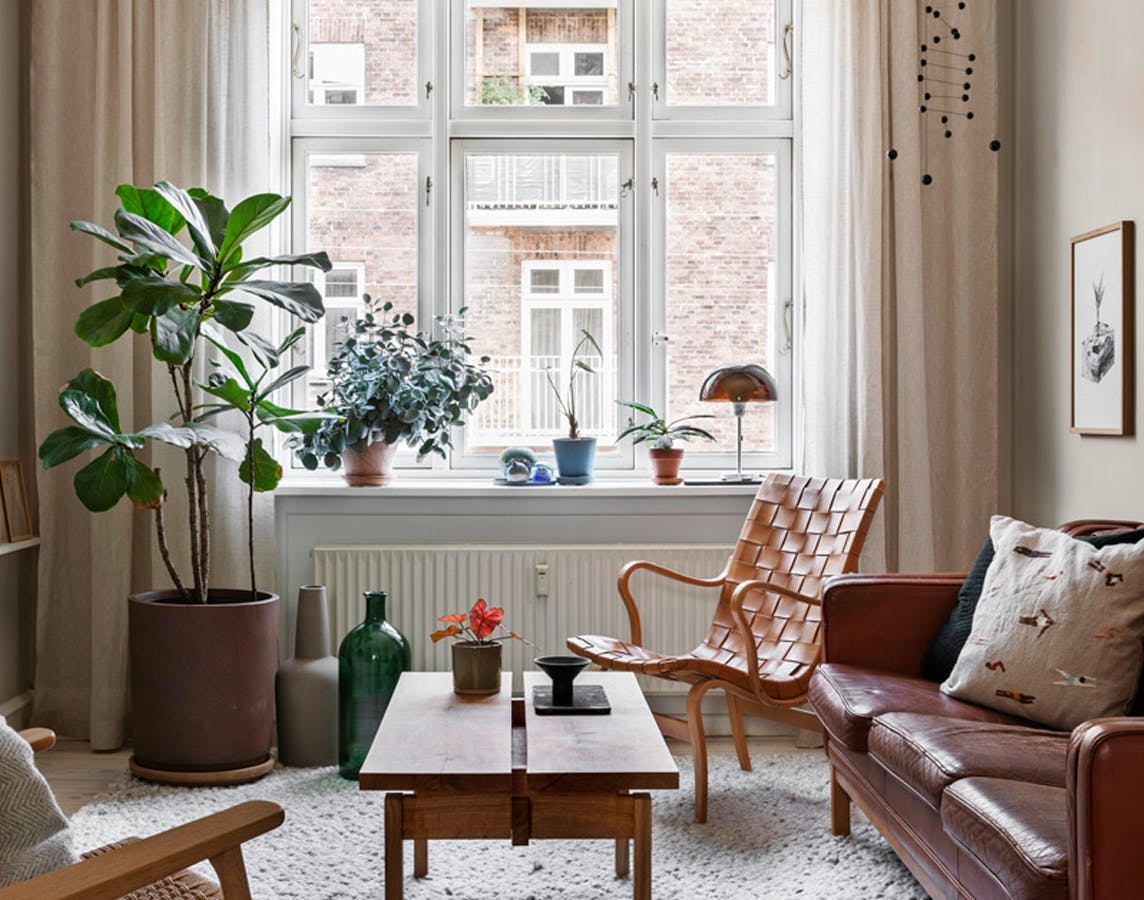 En stor stueplante fungerer næsten som et møbel i sig selv. Her er det en violinfigen, som skaber liv og giver stuen karakter.