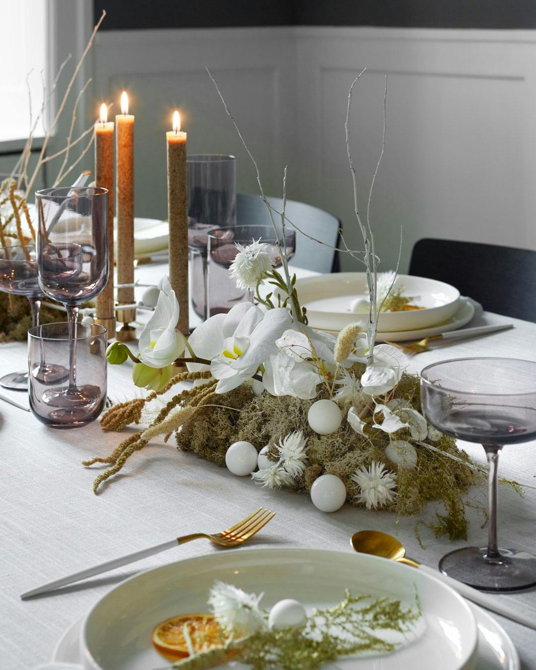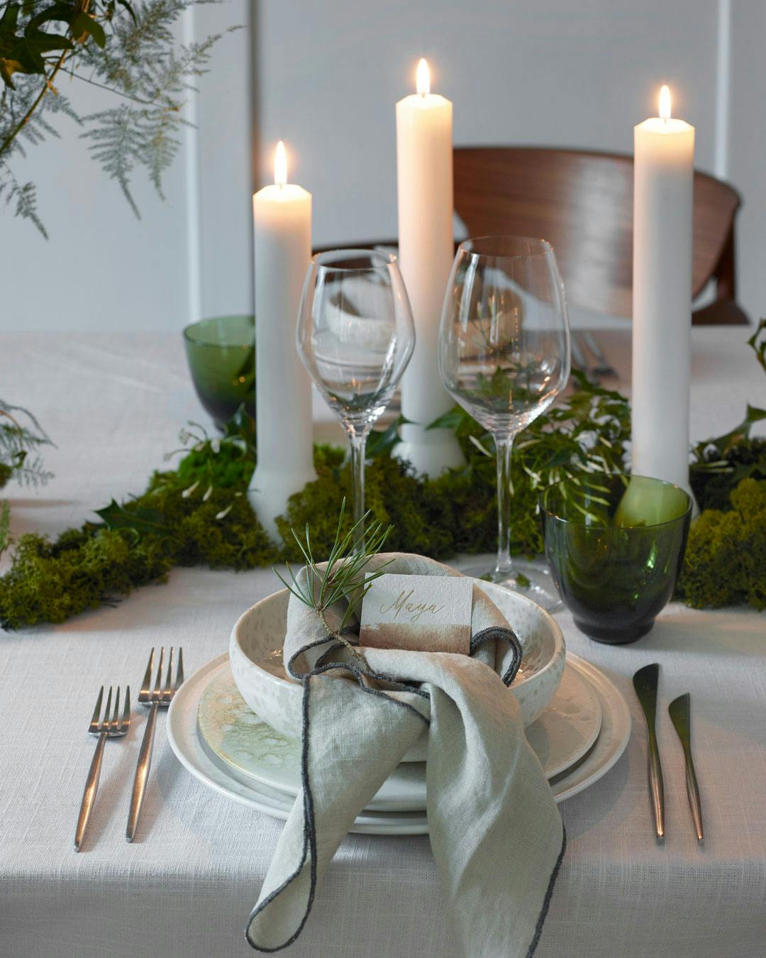 På bordet her skaber de grønne glas en fin reference til mos og pudemos, der vokser sammen med fine, hvide alterlyst. Sølvbestik og hvide tallerkner bryder helt elegant og let med de grønne toner men uden at trække opmærksomhed fra det naturlige look.
