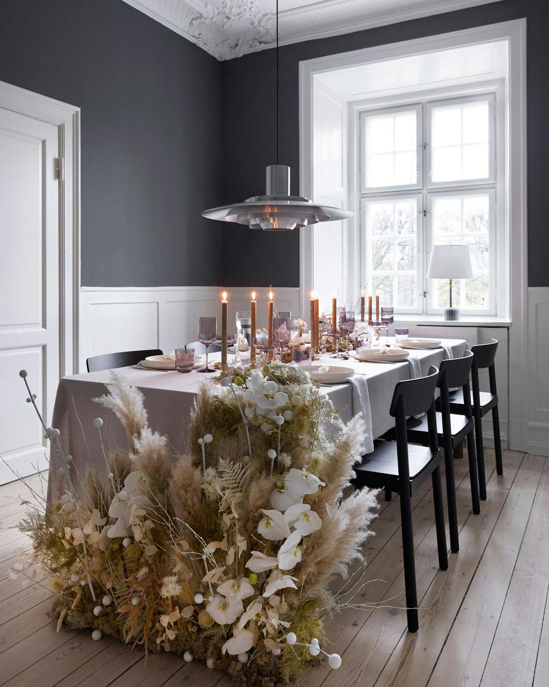 Har du god plads omkring bordet, kan du vælge at udvide borddekorationen og også tage gulvet i brug. På den måde giver du opdækningen en ekstra dimension, samtidig med at der bliver ekstra plads til at sætte stemningen med levende lys.