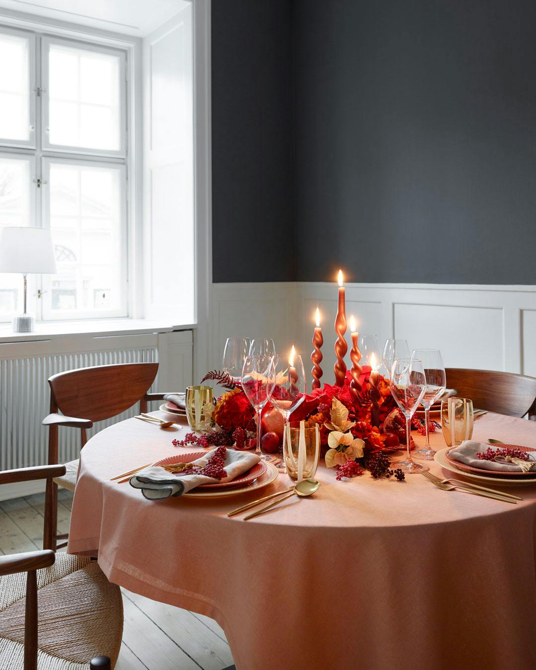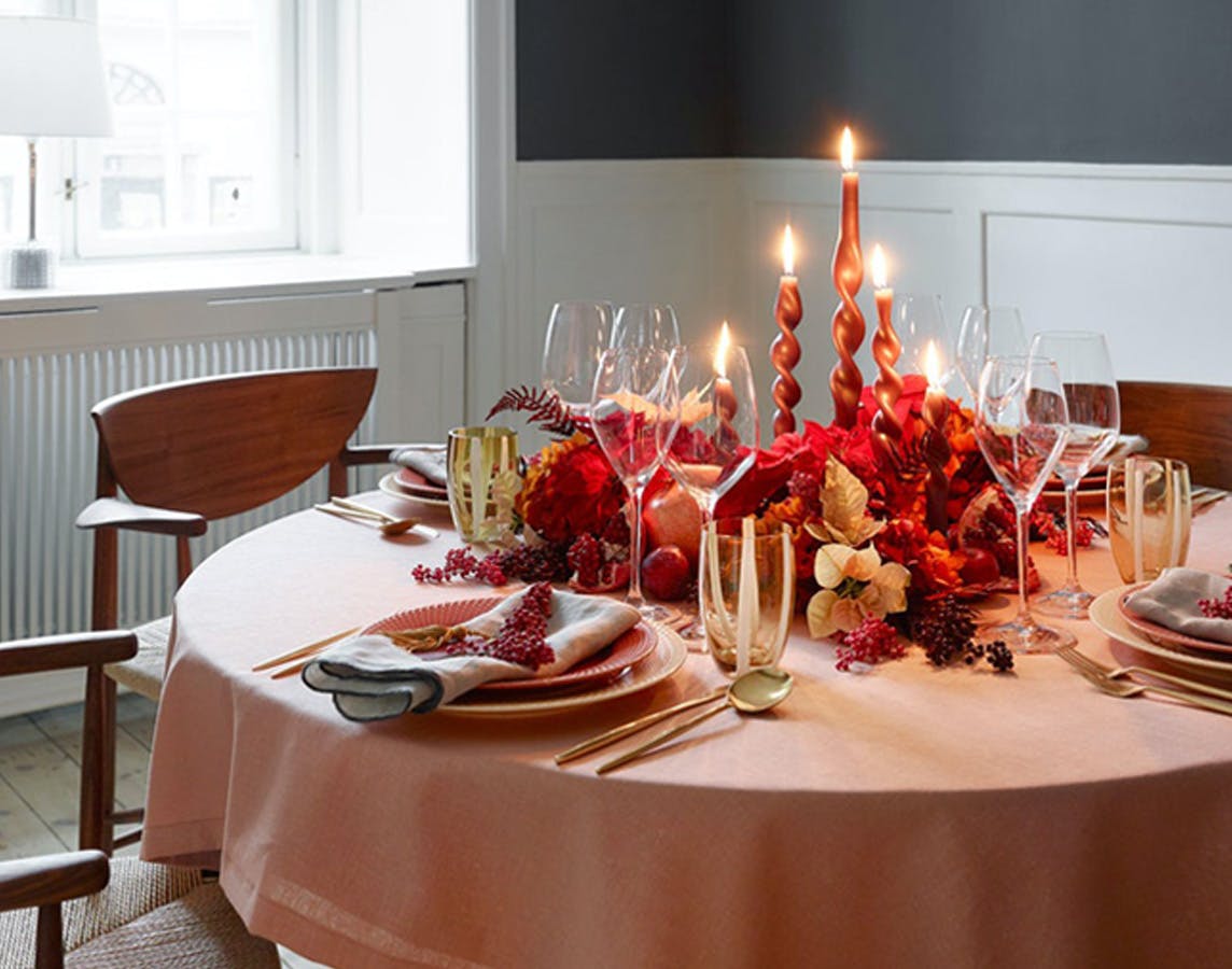 Lad de varme toner gå igen, og skab sammenhæng i borddækning med farvede glas og tallerkner, der matcher pynten.
