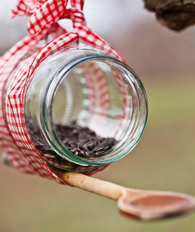I mange haver hænger de klassiske foderkugler, der kan købes i butikkerne - men faktisk er det også let at lave sine egne dekorative løsninger. Fat en grydeske af træ, et tomt syltetøjsglas og noget fint bånd - og du har det sødeste lille foderbræt på få minutter. Eller se flere foderbrætter i galleriet nederst i artiklen.