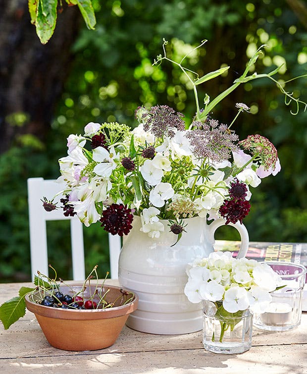 Billedet øverst i artiklen består af mørke blomster og skærmplanter, som er moderne for tiden og populære at bruge i buketter, der hverken må blive for romantiske eller fine i udtrykket. I den hvide kande står hvide skærmhortensiaer, sarte lyslilla ærteblomster, hvide skærmliljer, hvide staudelatyrus, brunrøde enkeblomster, mørk prydgulerod ’Black Knight’ (skærmblomsterne) og frøstande fra skvalderkål. En flot buket, der signalerer kontrolleret vildskab.