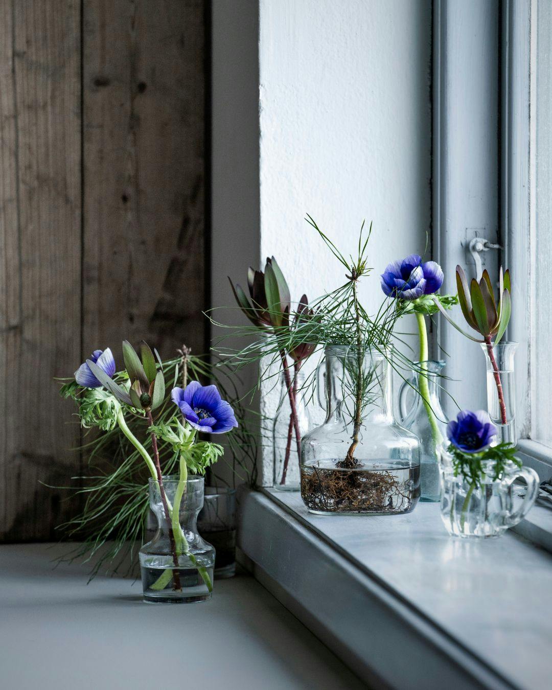 Giv vindueskarmen et strejf af jul ved at pynte den med små kviste af fyr i glasvaser. Det er nemt at fjerne jorden med lidt vand. Den grønne farve fra fyrrekvistene står smukt sammen med Leucadendron og mørklilla franske anemoner.
