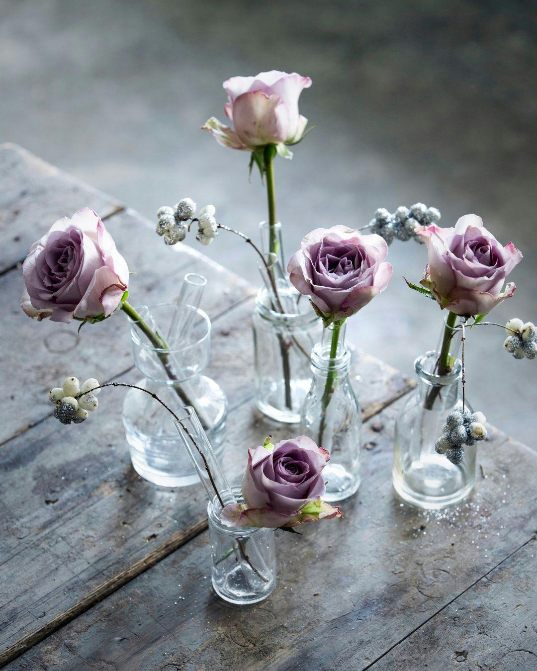 Giv nytårsbordet et strøg af glimmer, og lad snebærrene funkle sammen med roser i en sart gammelrosa tone. Det flotteste resultat får du, hvis du giver snebærrene lidt limspray og dypper dem i glimmer. De behøver ikke at være helt dækkede. Hvis du vil gøre lidt ekstra ud af bordet, kan du placere stilkene i reagensglas, som er sat ned i små vaser. Reagensglas kan købes hos blomsterhandleren.